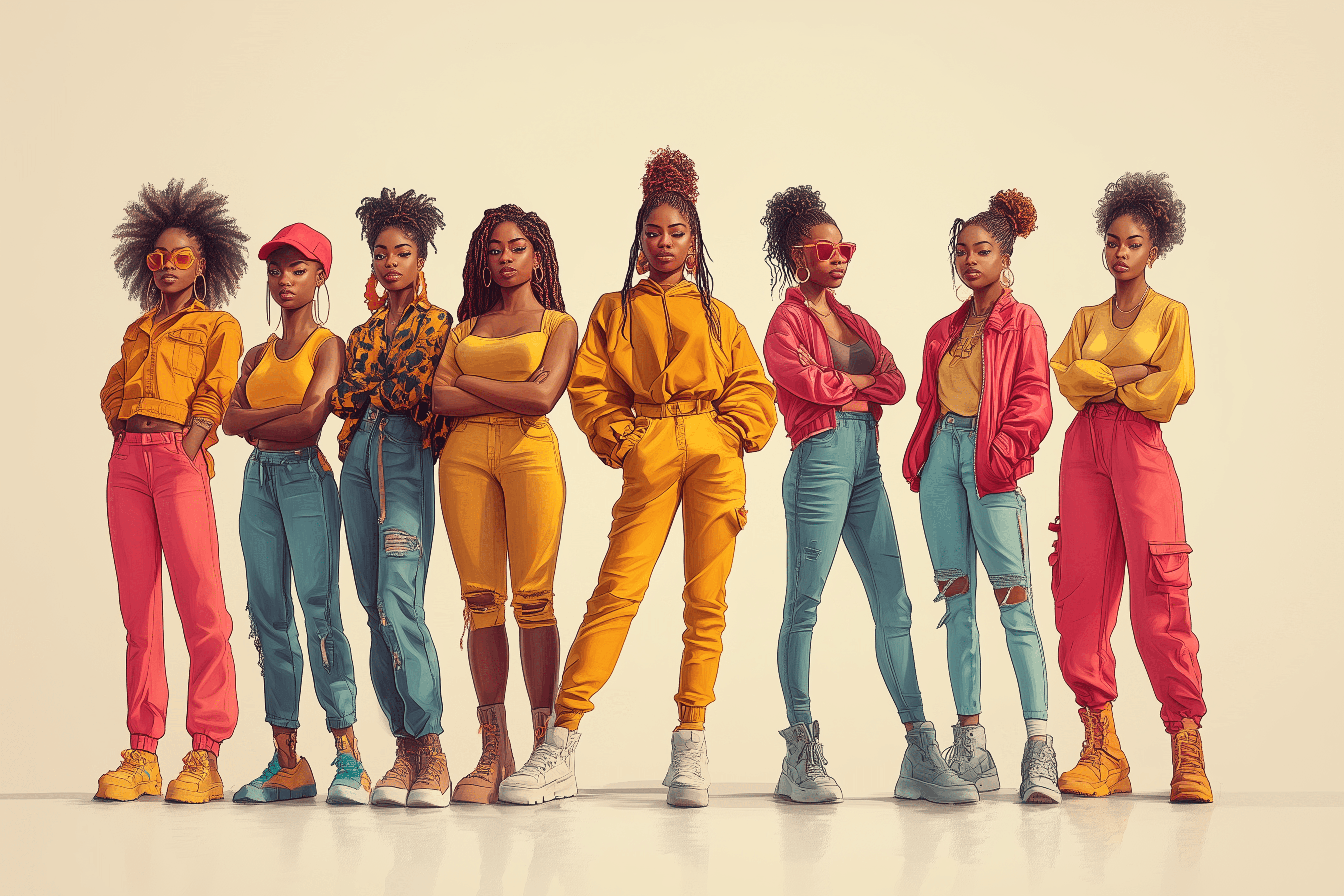 A vibrant and empowering image capturing a diverse group of Black women with varying skin tones, showcasing unity and individuality through their stylish clothing and confident expressions.