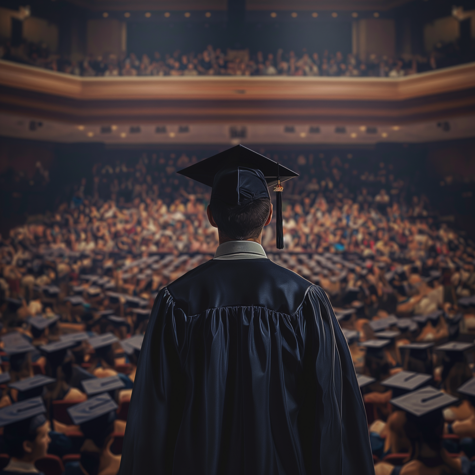 A college graduate stands confidently at the front of a packed auditorium, dressed in a graduation gown and cap. The atmosphere is filled with anticipation as fellow students fill the seats, creating a sense of unity and celebration.
