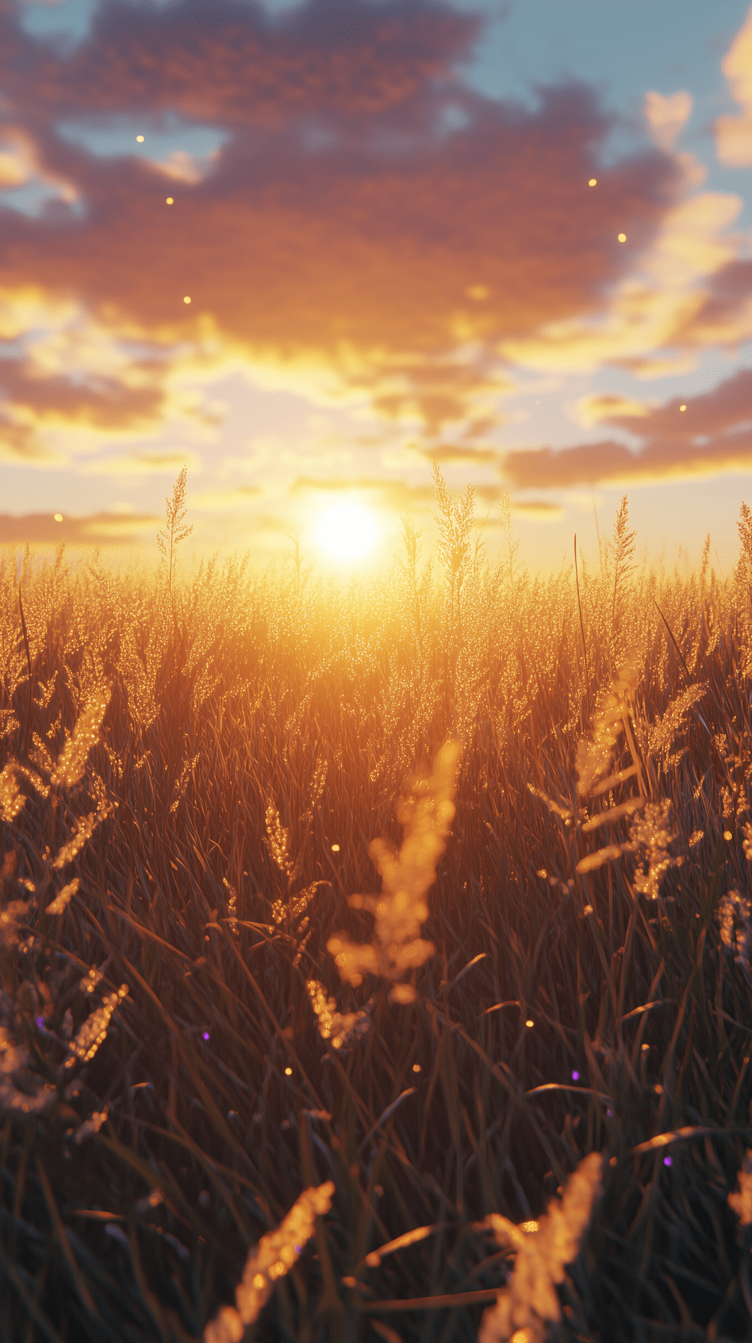 The image captures a vast grassland with high grasses gently swaying in the breeze during a stunning sunset. The warm glow of the sun creates a captivating flare, enhancing the photorealistic quality of the scene.