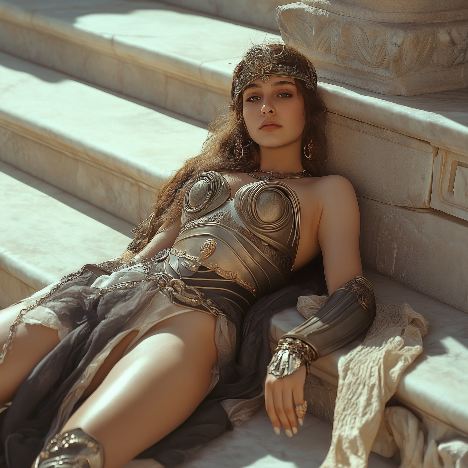The image showcases a stunning figure embodying a Greek goddess, exuding grace and strength. Draped in minimal armor, the goddess reclines elegantly on the stairs of a majestic palace, surrounded by classical architecture.