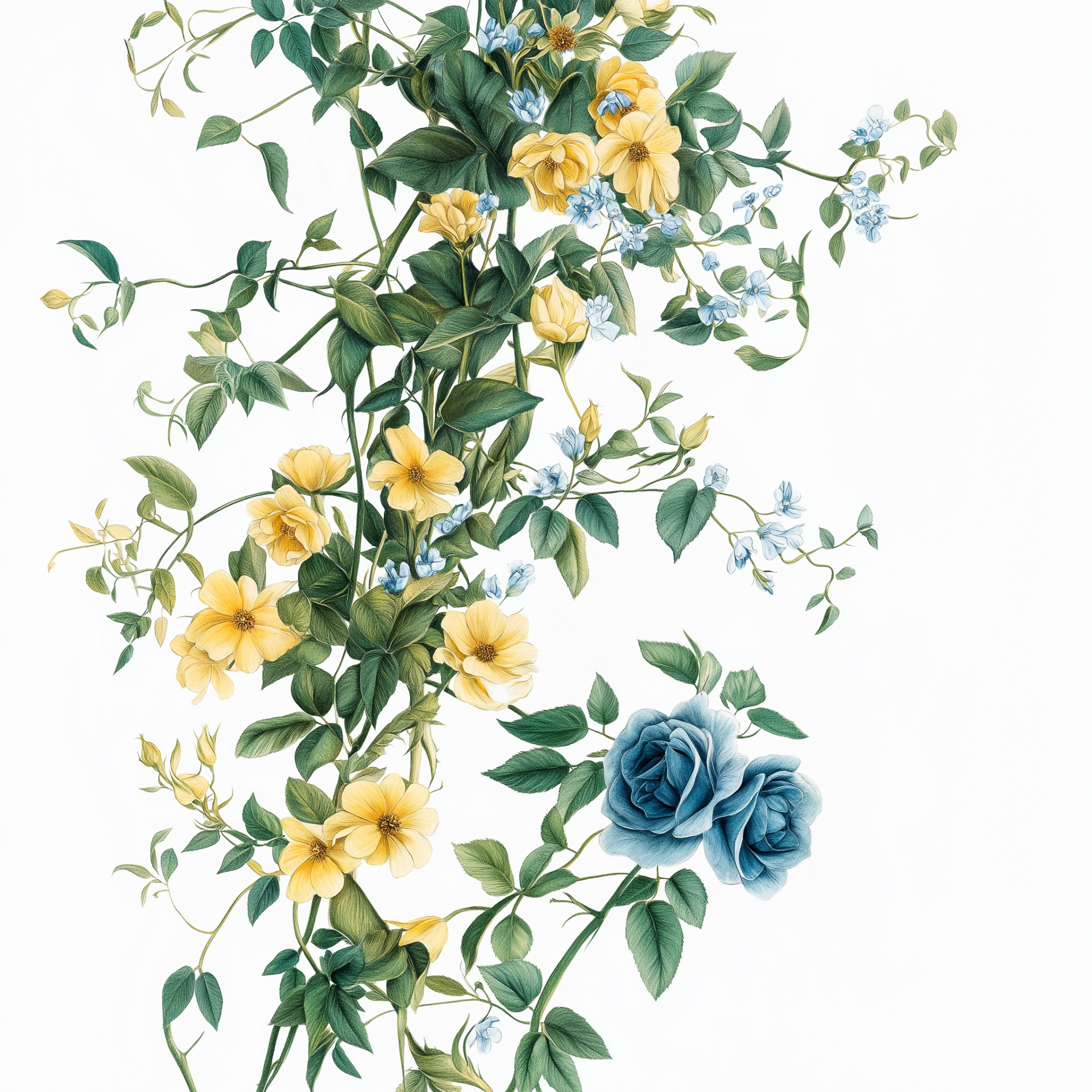 The image features a lush climbing plant with twisting vines that exude elegance. It showcases vibrant yellow flowers on one side and a striking blue rose on the other, set against a pure white background.