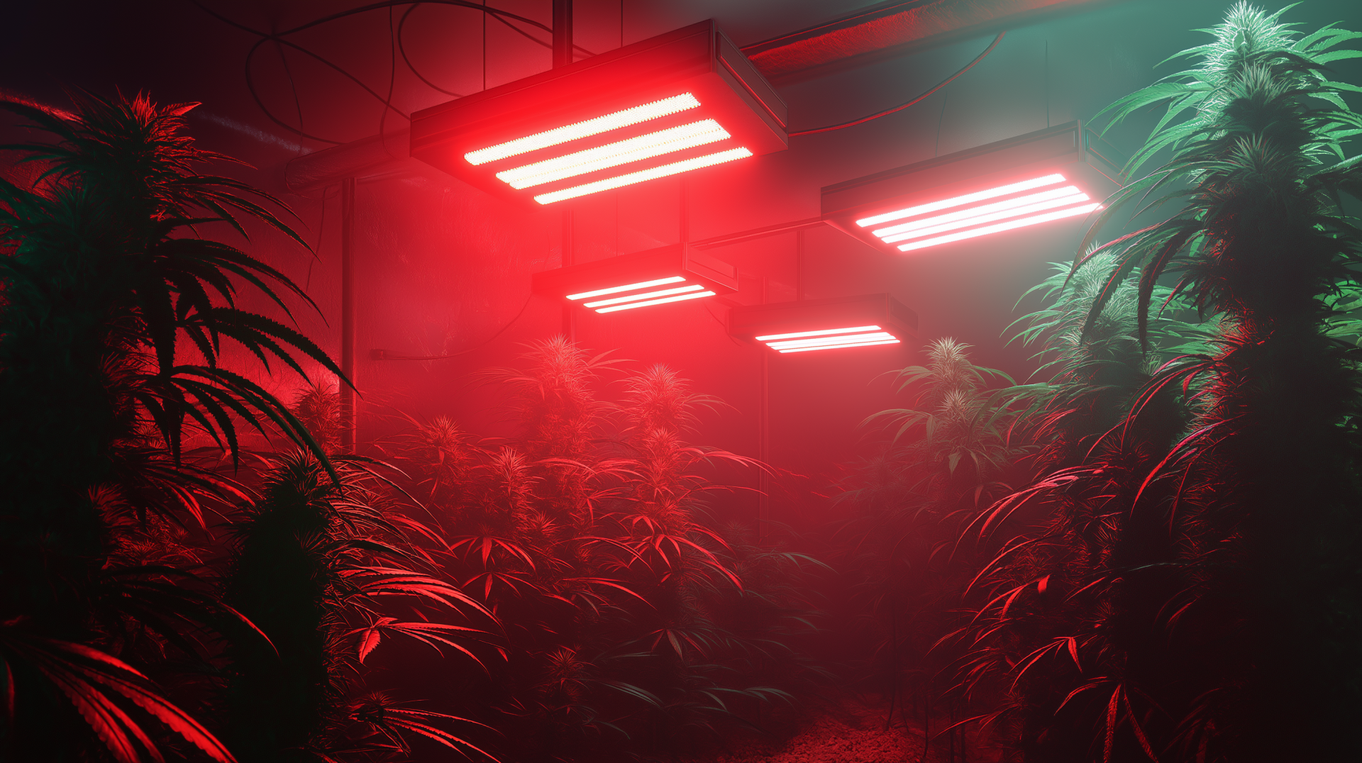 This image captures a vibrant indoor cannabis growing room illuminated by bright LED lamps. The cinematic lighting creates a dramatic sin city style atmosphere, evoking a sense of modern urban cultivation.