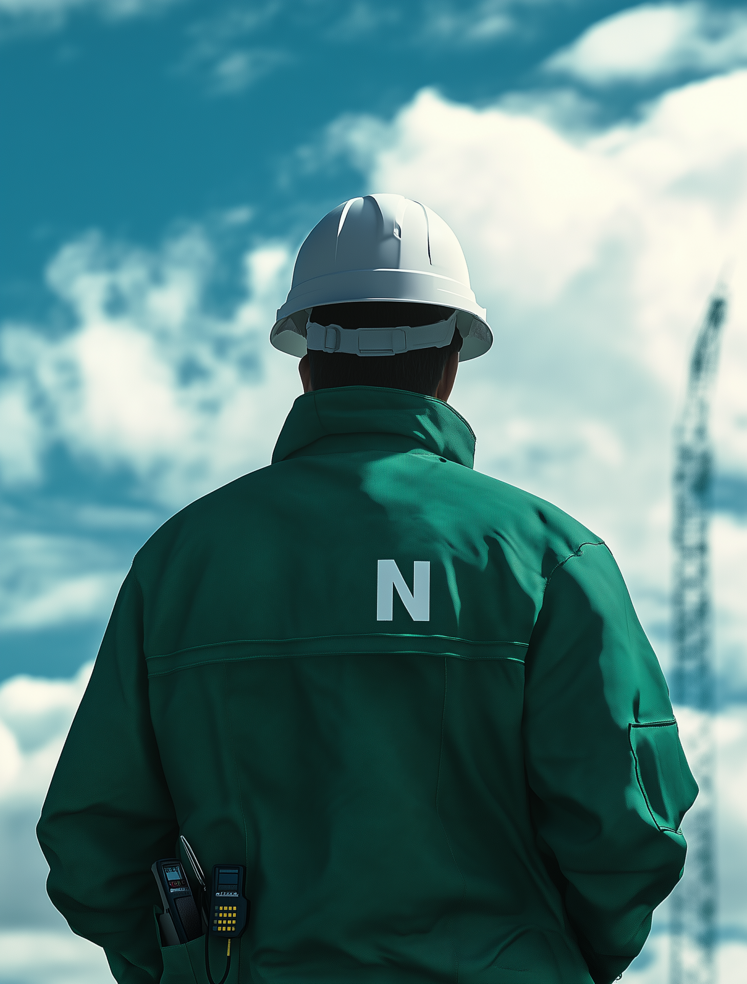 The image captures the back view of an engineer dressed in a vibrant green work jacket and a white hard hat. He is holding a walkie-talkie, suggesting an active work environment focused on construction or engineering.