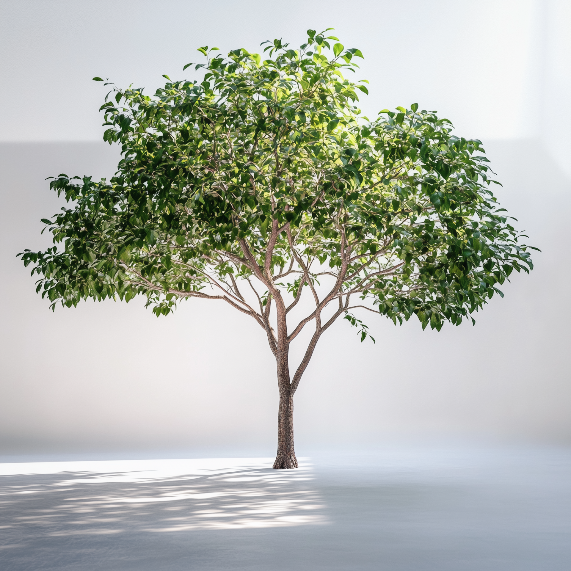 This image showcases a large, healthy tree blooming with lush green leaves in a pristine photo studio. The strong trunk and vibrant foliage are beautifully illuminated by softbox lighting, set against a seamless white backdrop.