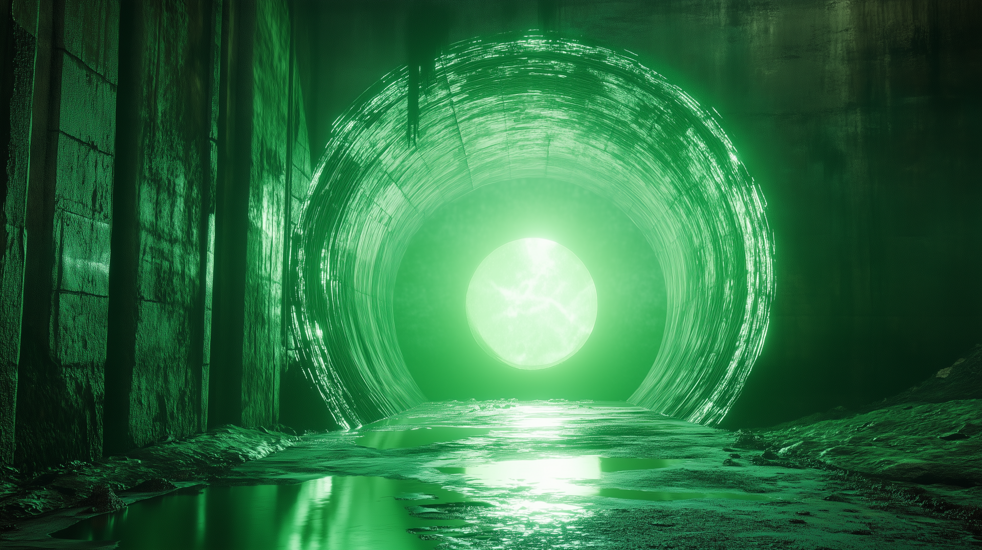 The image features a vivid green portal that draws the eye into its mysterious depths. The swirling patterns and vibrant hue create an otherworldly atmosphere, inviting curiosity and exploration.