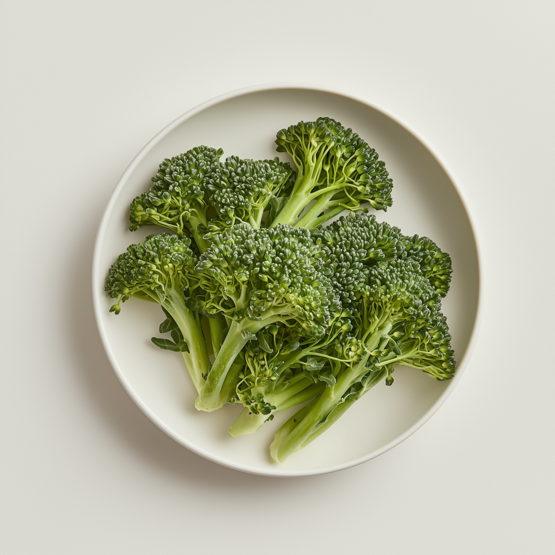 The image features vibrant baby broccoli arranged on a clean white plate, presenting a fresh and healthy appeal. The top-down shot highlights the natural texture and color of the broccoli against the simplicity of the plate.