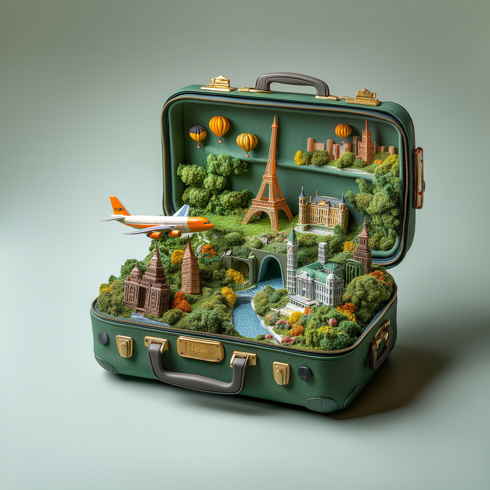 The image features a bright green Rimowa suitcase, elegantly opened to showcase a delightful miniature scene of famous landmarks alongside travel-themed items. The high contrast with a white background accentuates the vibrancy of the suitcase and the whimsy of the miniatures.