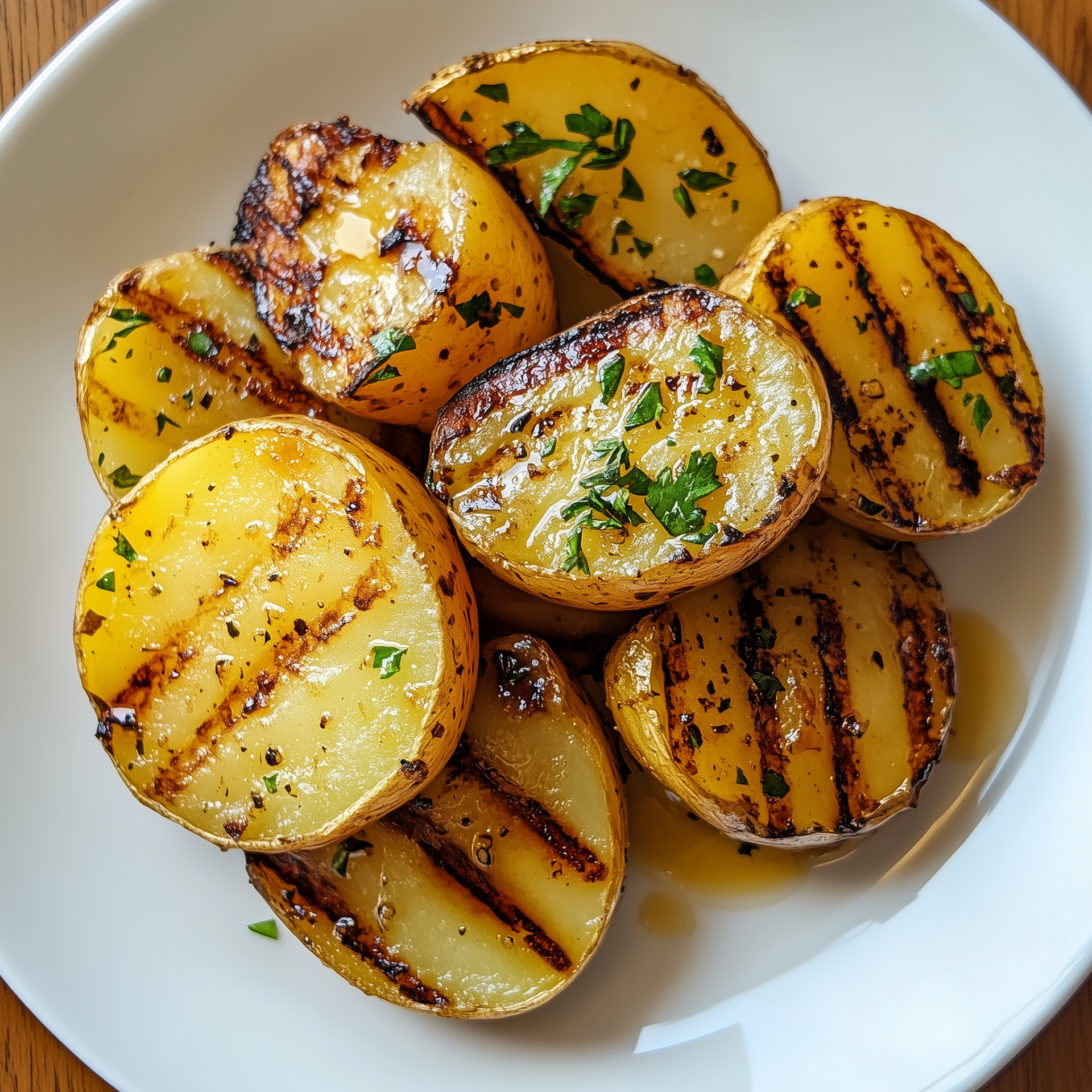 The image features a hyper-realistic grilled potato perfectly placed on a pristine white plate. The golden-brown exterior glistens, showcasing the textures and grill marks that enhance the visual appeal.