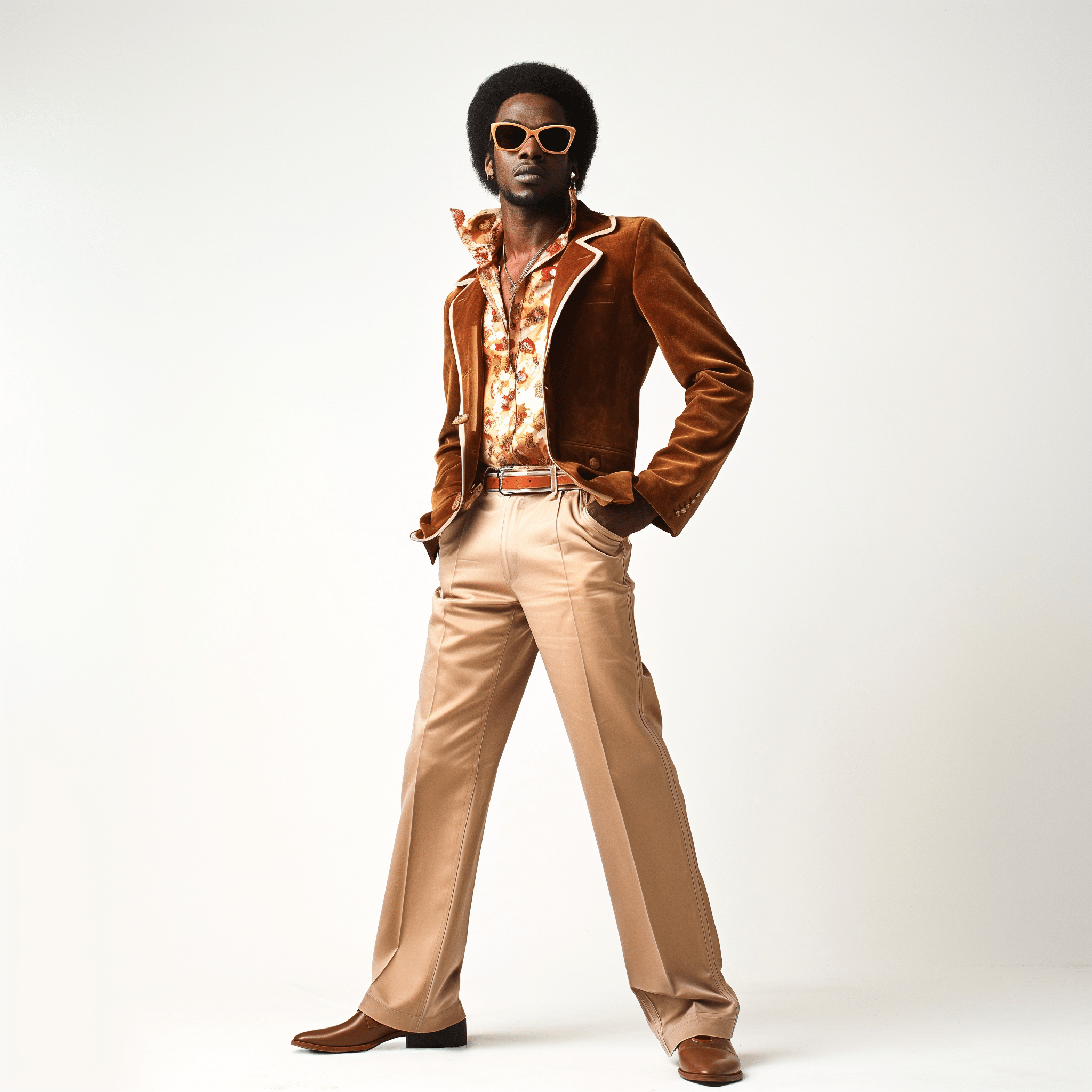 A photo capturing the essence of 70's fashion with a stylish African American man exuding confidence and charisma. The full-body shot emphasizes the unique retro style against a clean white background.