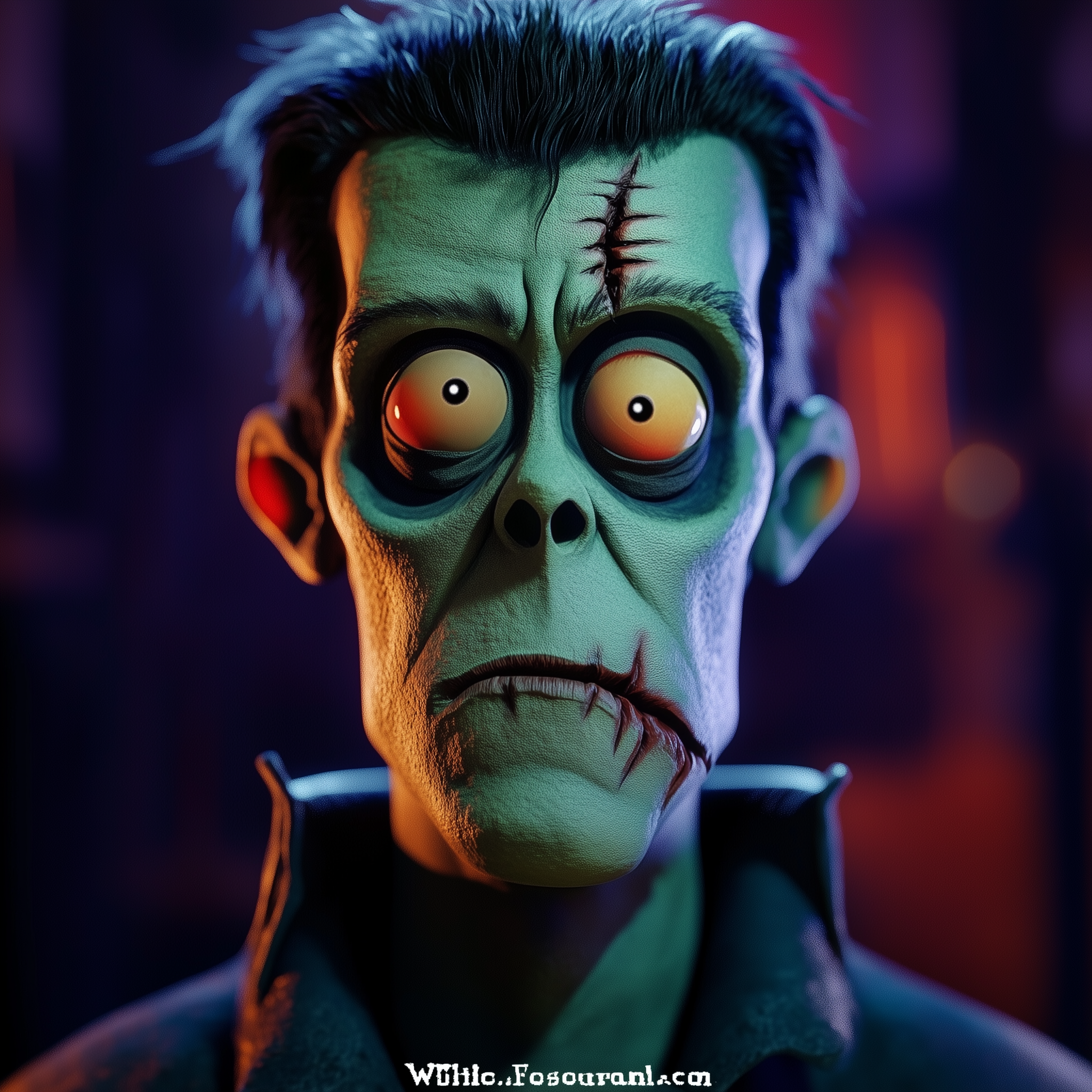 This illustration features a cartoon-style Frankenstein with a surprised expression. Set in a gym environment, the character has a green face, noticeable scars, and striking yellow eyes.