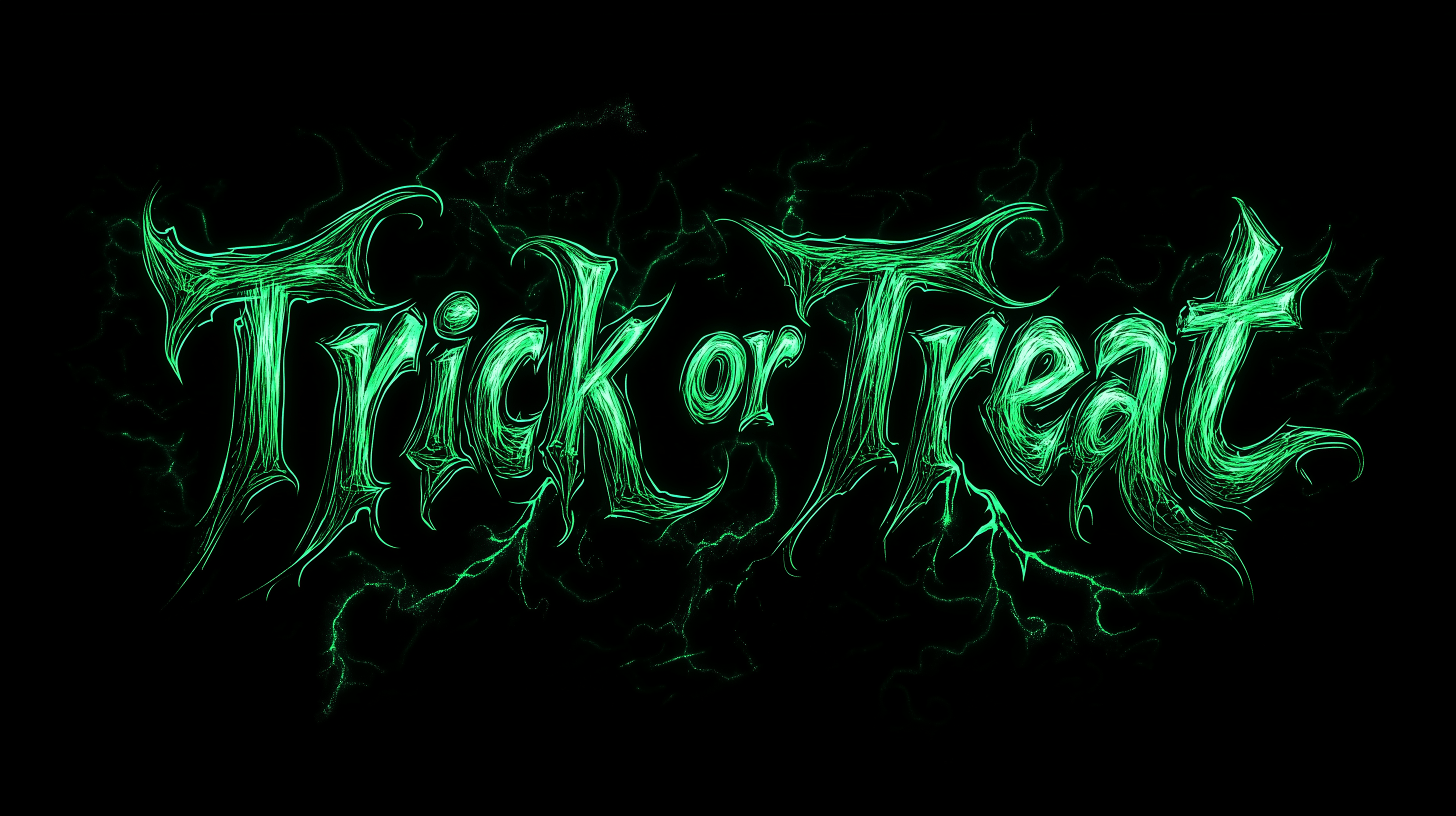 This image features a striking black background that enhances the horror aesthetic. The fluorescent green gothic font boldly displays the phrase 'Trick or Treat', creating a captivating and eerie atmosphere.