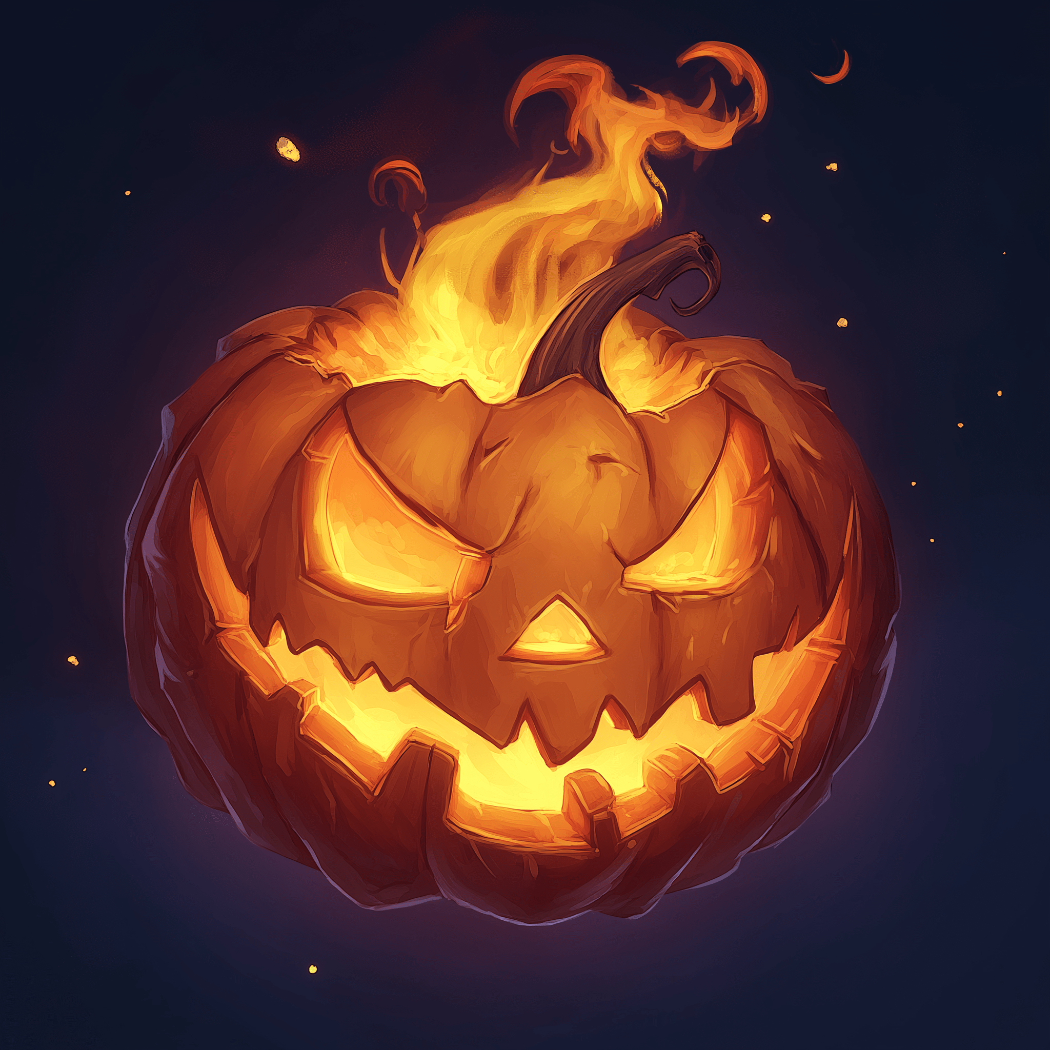 This image features a cartoon-style jack o' lantern with vibrant flames emanating from its interior. The colors are bright and playful, creating a lively and festive atmosphere.