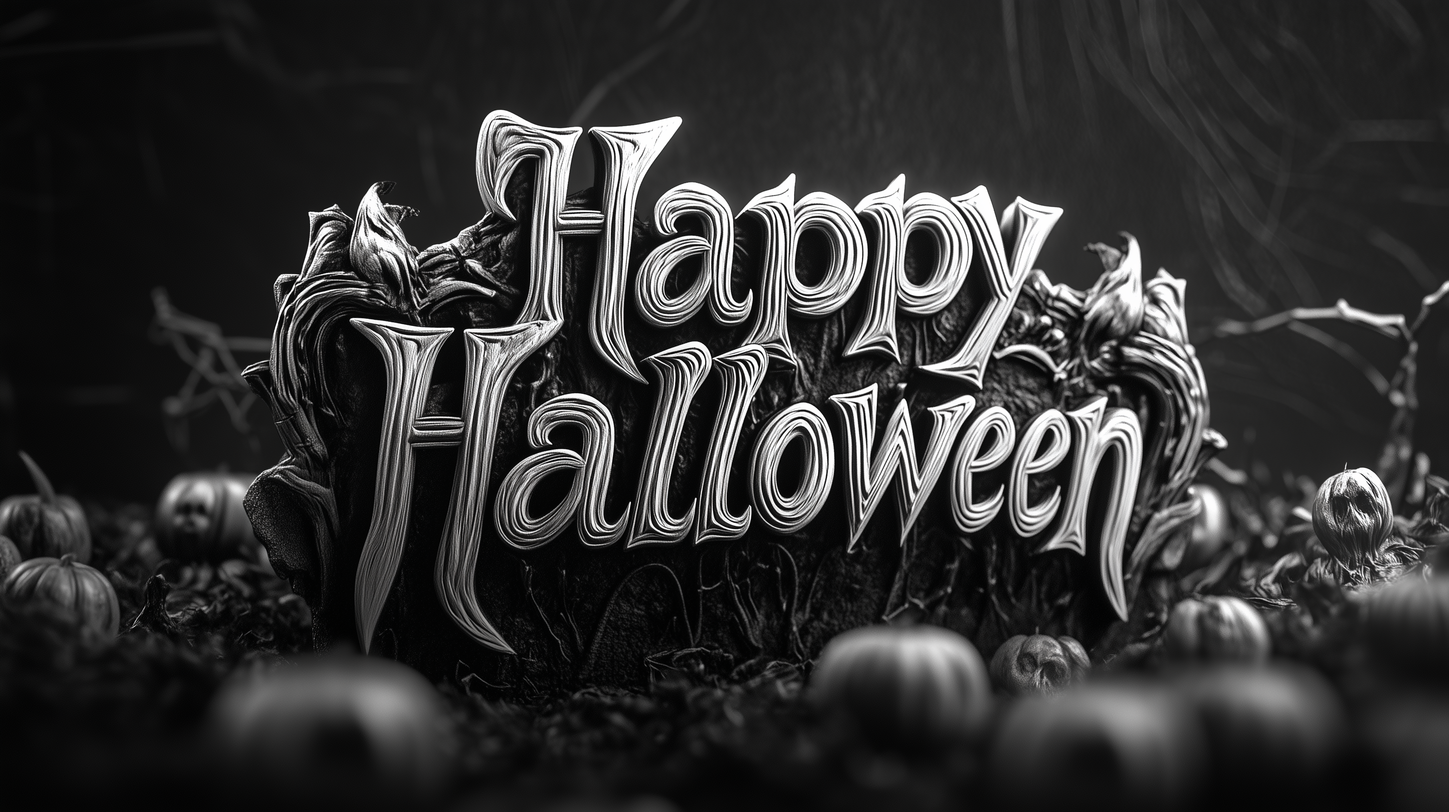 The image features the words 'Happy Halloween' rendered in a 3D spooky font, crafted from solid silver. Set against a stark black background, the text emits an eerie yet elegant vibe, perfect for the Halloween season.