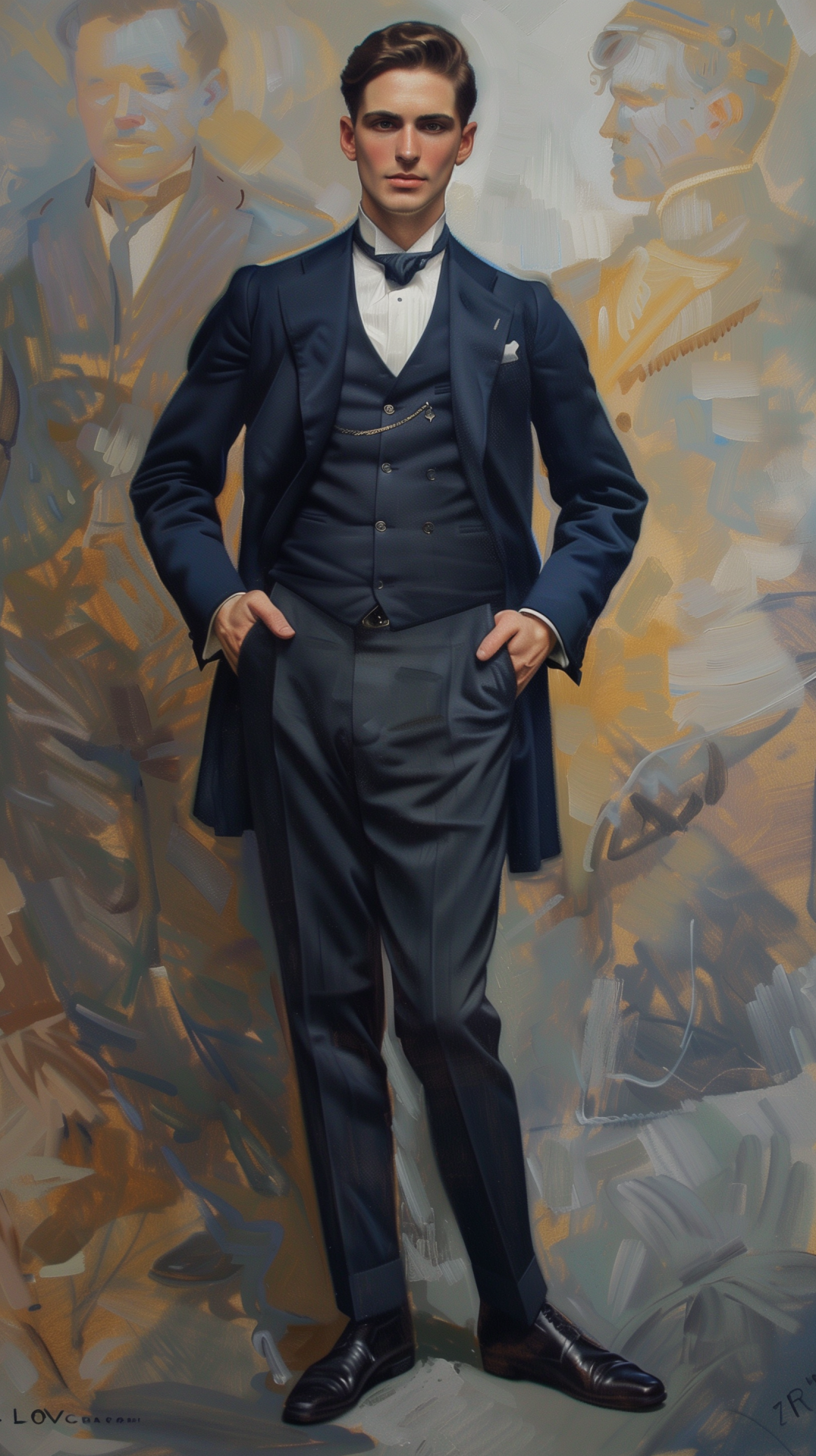 This illustration features a handsome Caucasian gentleman dressed in a dark blue morning suit from the 1890s. With a direct gaze towards the viewer, the artwork captures the elegance and charm characteristic of classic American portraiture.