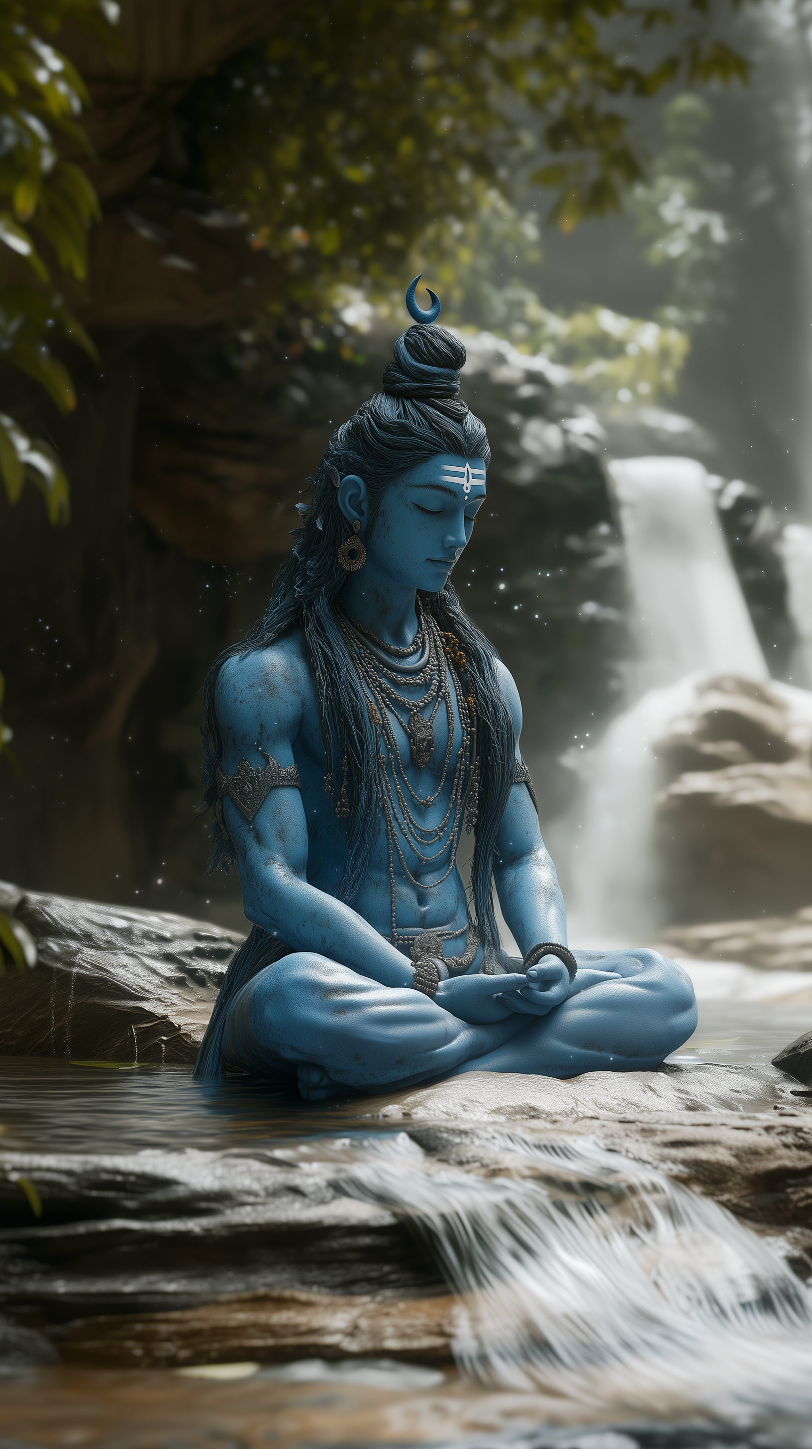 This illustration features a handsome figure with cyan skin seated in a serene heavenly atmosphere. The backdrop showcases a beautiful sky, enhancing the divine and tranquil essence of the character.