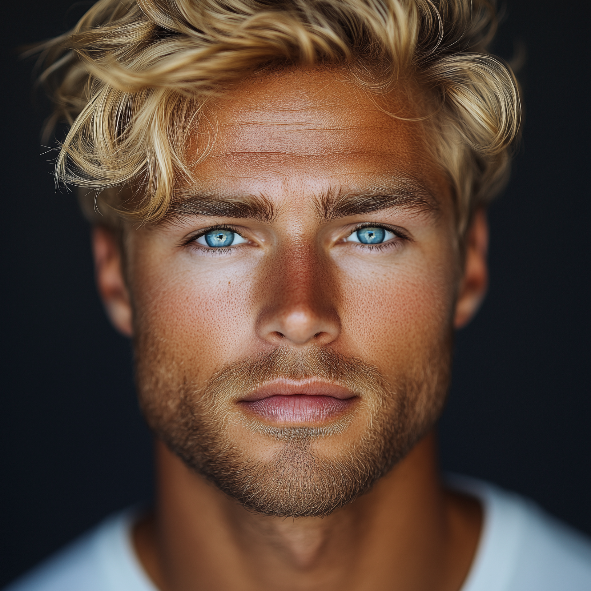 The image showcases a strikingly handsome male with defined muscles. His blonde hair and piercing blue eyes create a captivating and athletic appearance.