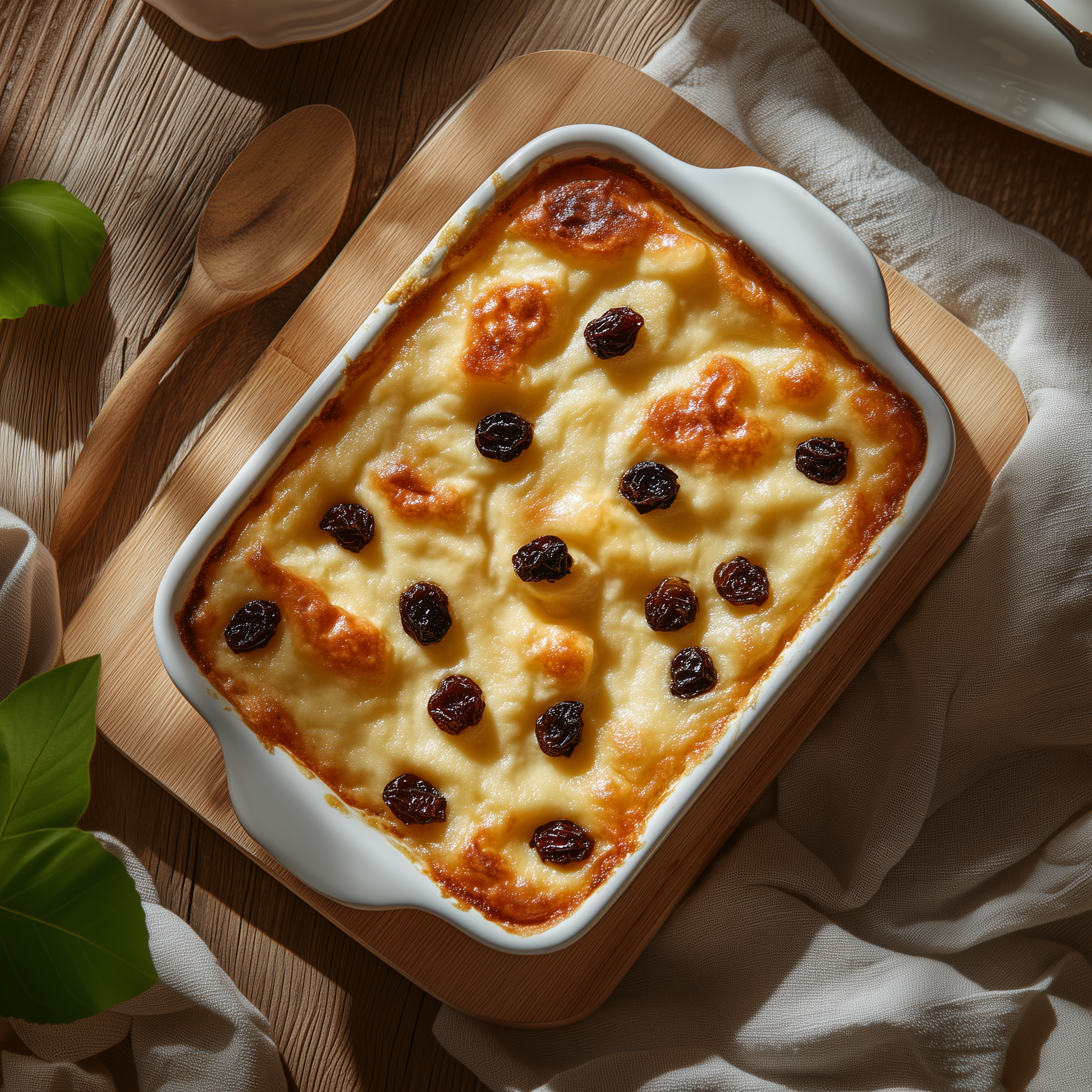 A cozy and inviting image of a cottage cheese casserole with sweet raisins, presented on a rustic light wood board. The photo captures the dish from a top-down angle, showcasing its warm and appetizing appearance.
