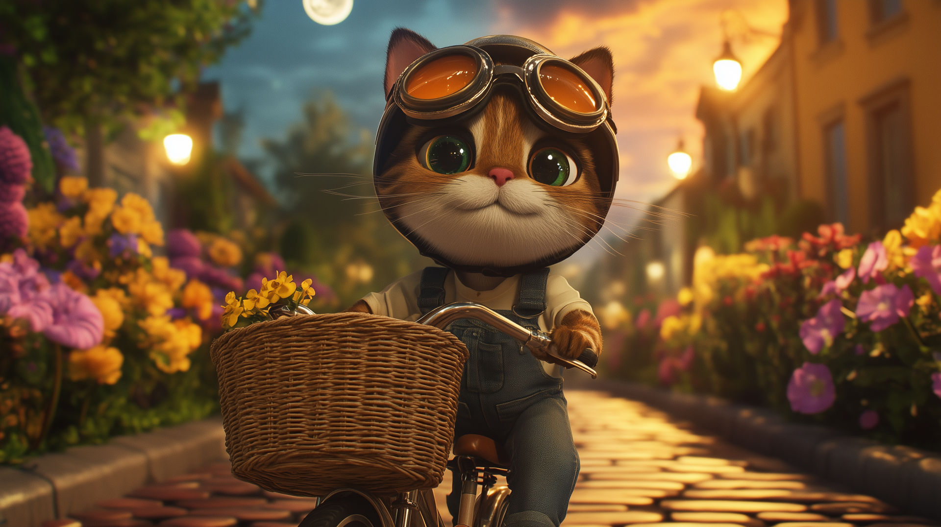 This lively image depicts a joyful cat and dog riding bicycles along a path adorned with beautiful flowers. The colors are bright and cheerful, creating a playful and inviting atmosphere.