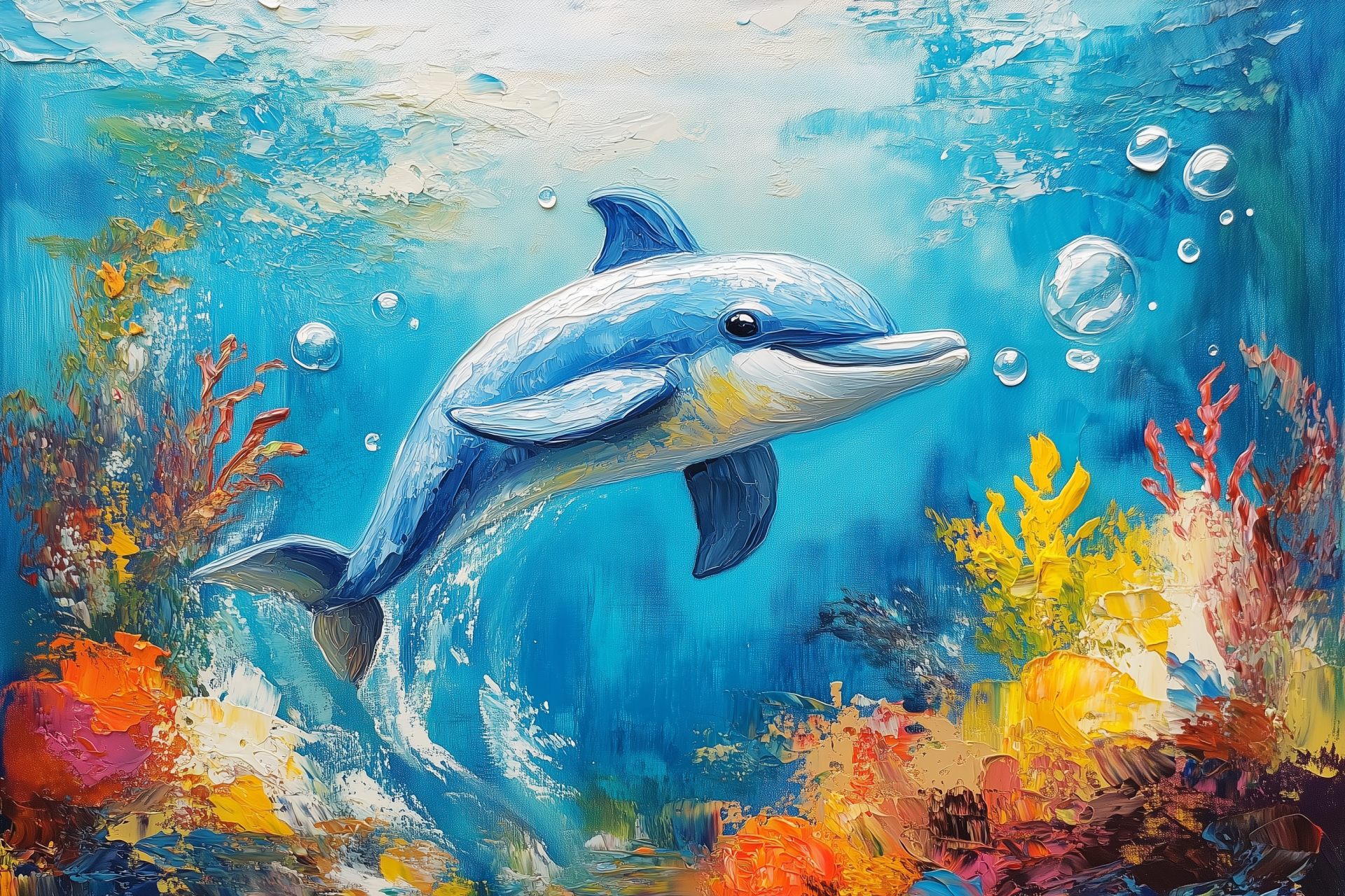 This whimsical oil painting showcases a lively dolphin gracefully swimming through a vibrant sea. The underwater scene is filled with colorful coral and sea plants, all depicted with thick, expressive brush strokes that create an inviting atmosphere.