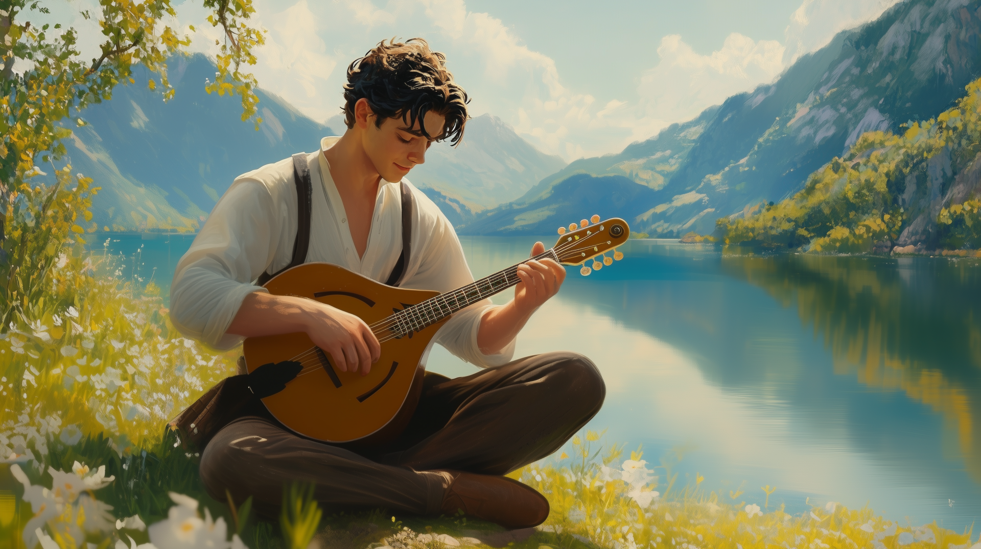 This illustration features a handsome young man with striking features set in a whimsical, Ghibli-inspired landscape. The vibrant colors and enchanting details create a magical atmosphere that captivates the viewer.