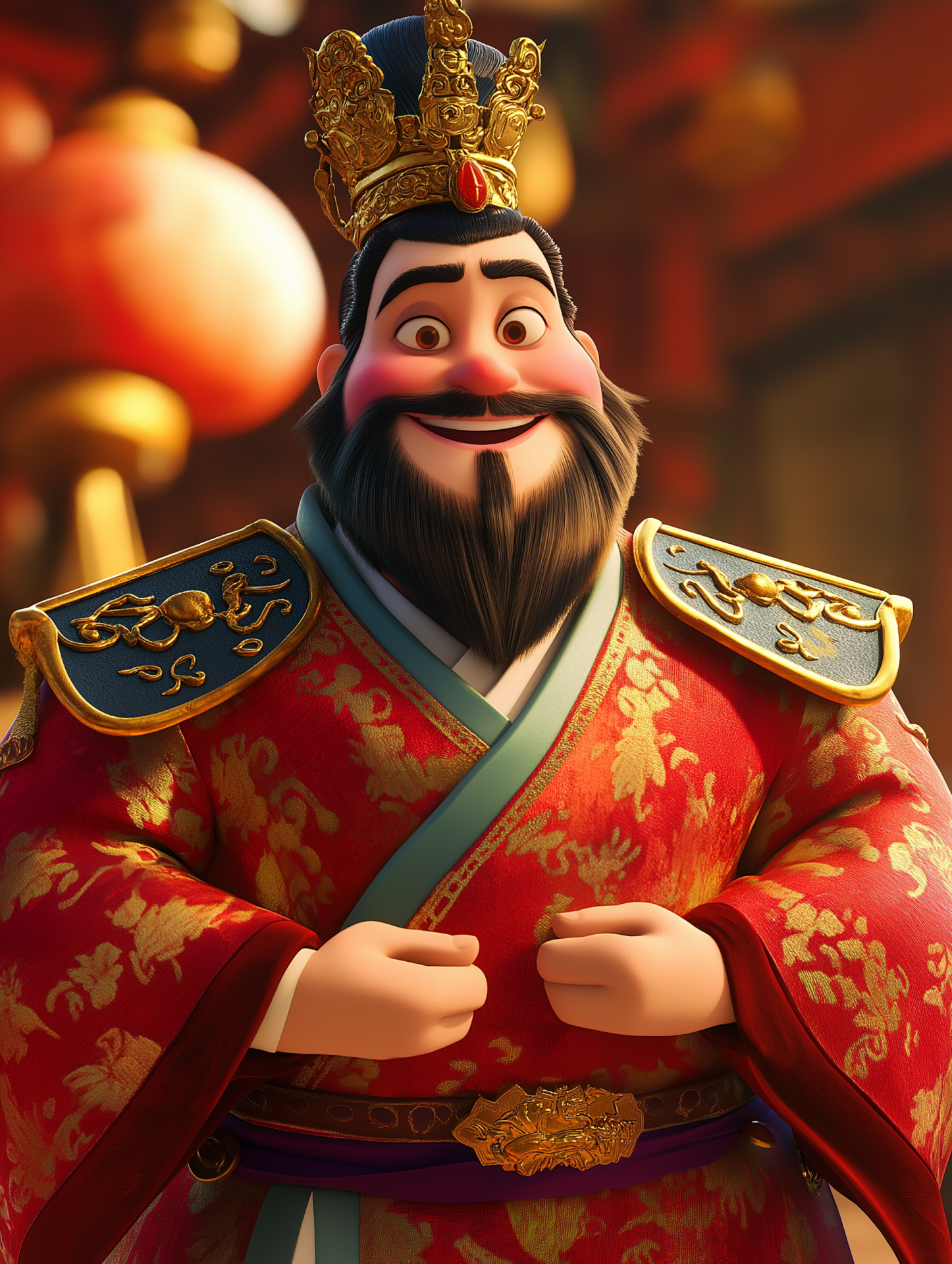 A cheerful emperor is depicted with a bright, sunny smile, radiating joy and happiness. The illustration conveys a whimsical and vibrant atmosphere, perfect for capturing the essence of delight.