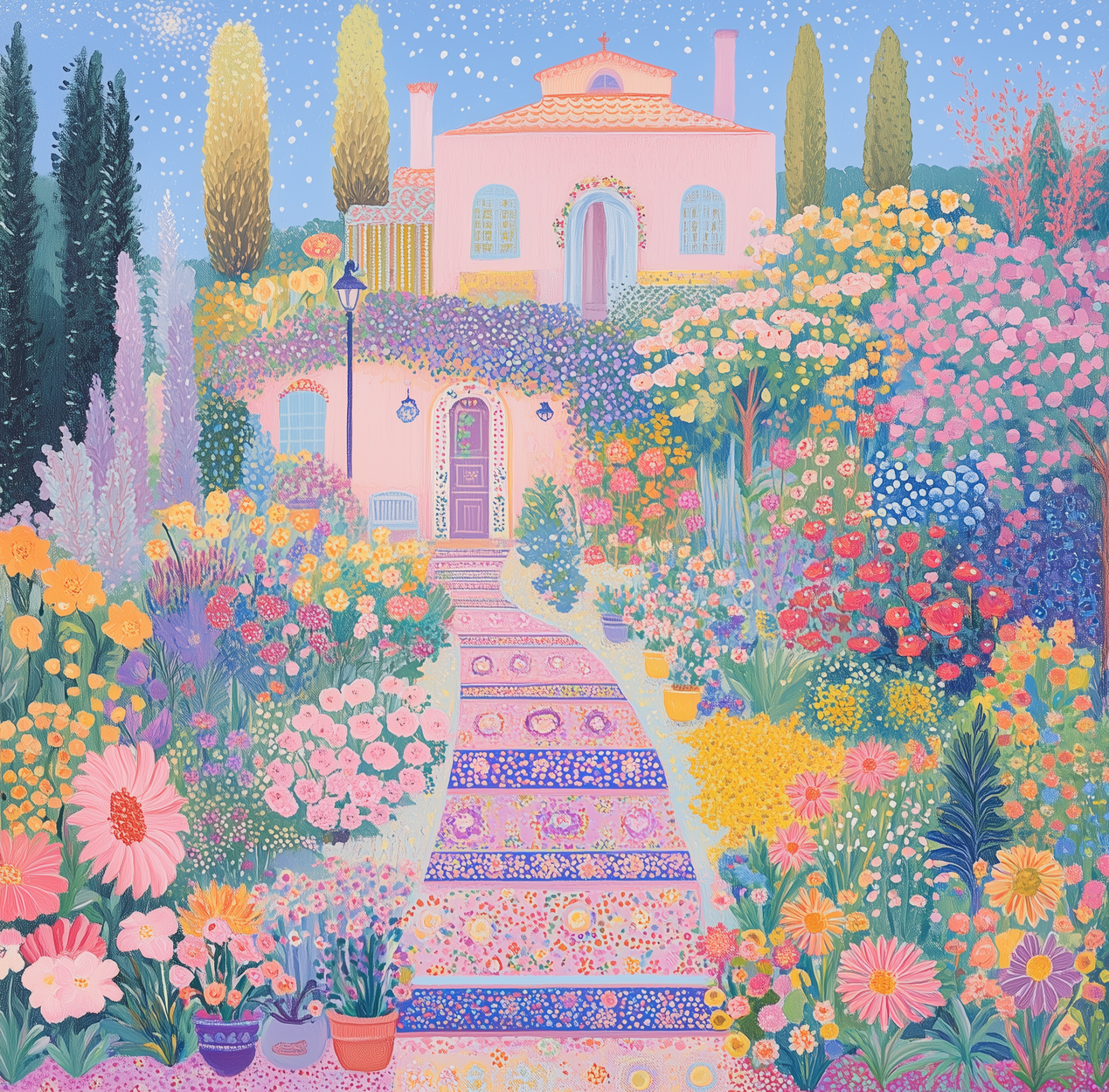 This illustration showcases a vibrant garden filled with colorful, patterned tiles and a variety of flowers and plants. The scene is bright and playful, capturing the essence of a cheerful outdoor space inspired by children's book art.