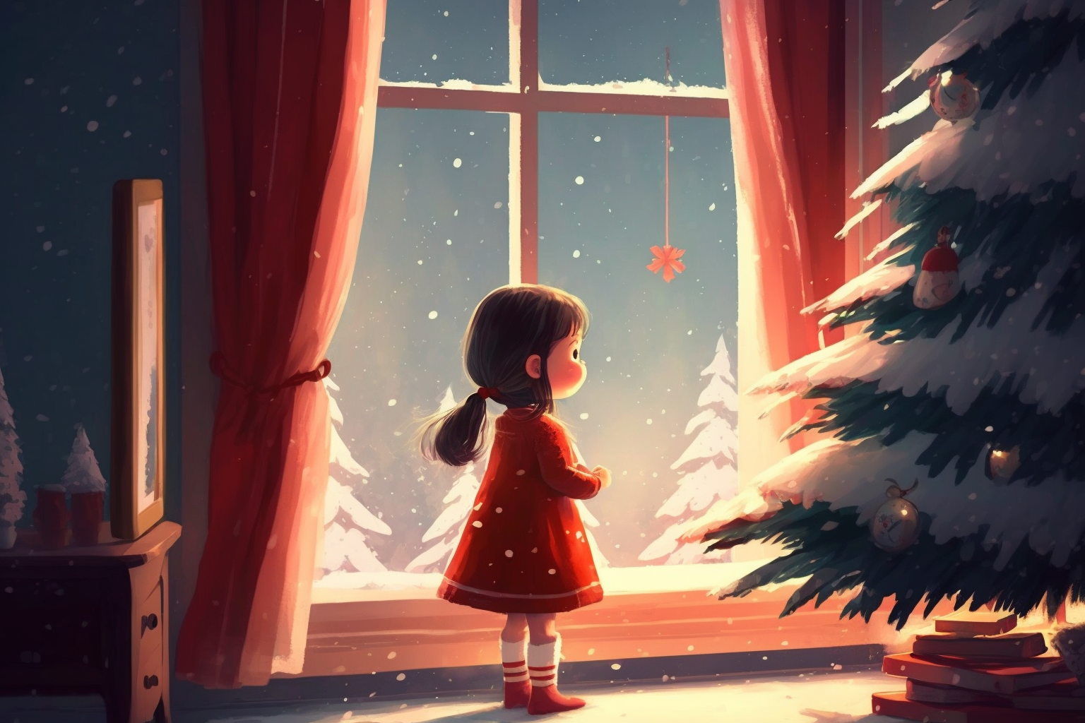 A heartwarming illustration of a cute Asian girl enjoying the Christmas season in a cozy room. The scene is filled with soft light, warm colors, and a beautifully decorated Christmas tree, creating a dreamy and festive atmosphere.