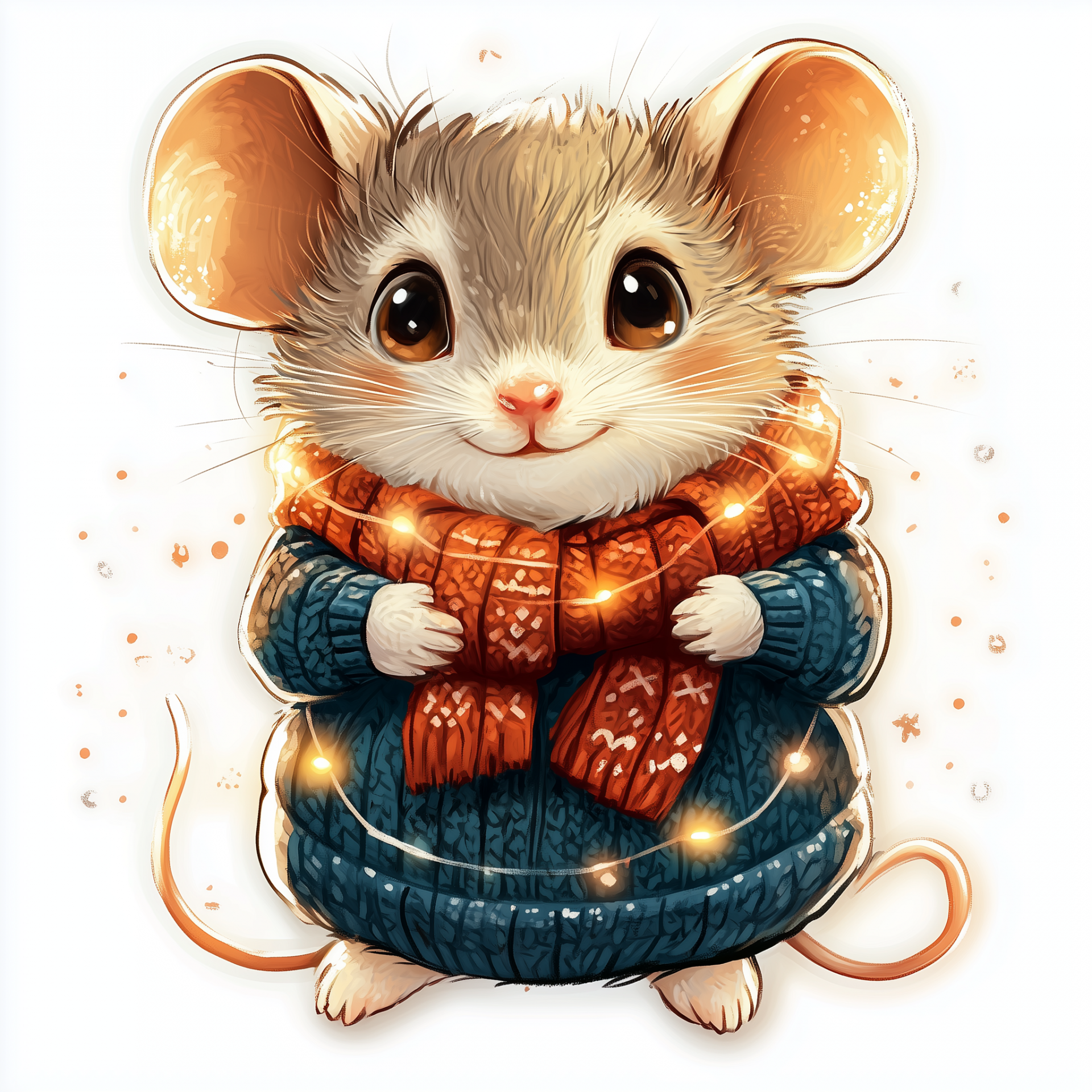 This illustration features a charming little mouse wearing a festive New Year's sweater. The mouse is depicted in a bright and colorful style, exuding a playful winter spirit.