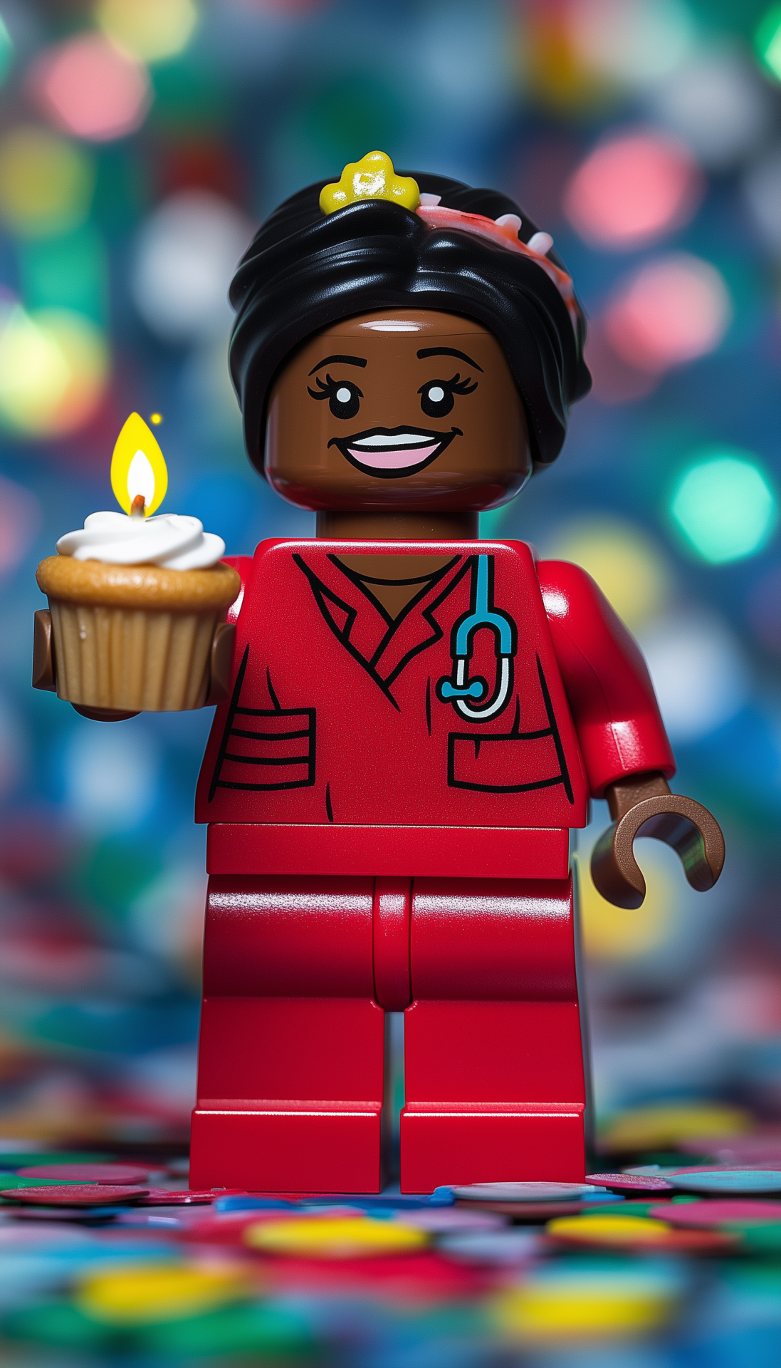 This vibrant image features a Lego figure of an African American nurse dressed in red scrubs, joyfully holding a muffin with a candle. The background is filled with colorful confetti, adding to the celebratory atmosphere.