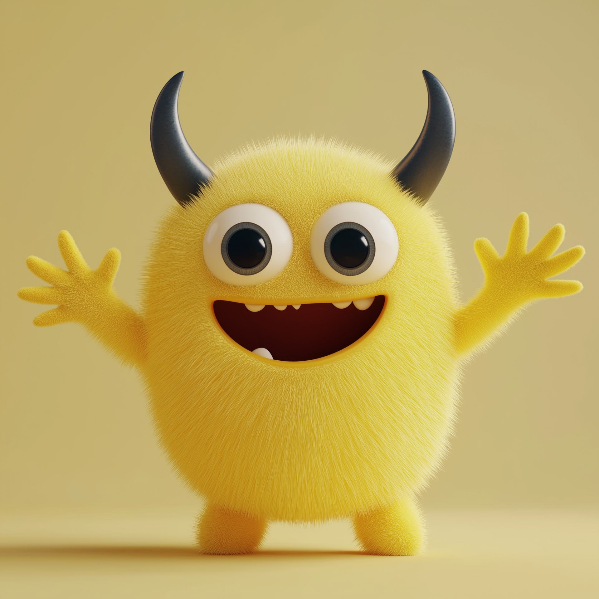 This image features a cute little baby monster with cheerful yellow skin and big round eyes. It has a happy expression and appears excited, with its hands raised against a plain background.