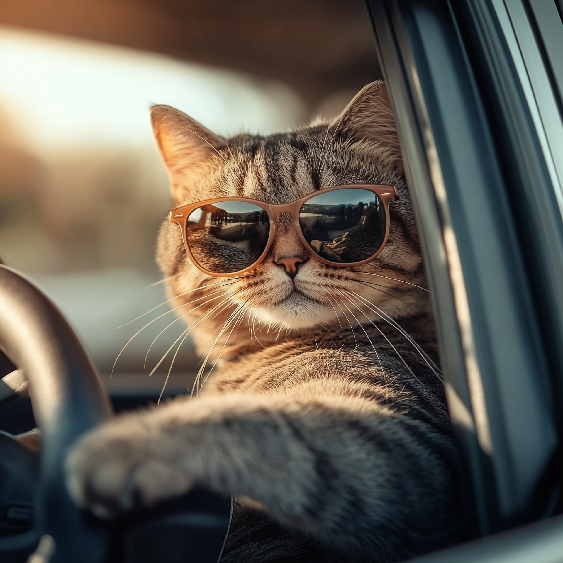 A happy cat wearing dark sunglasses sits at the wheel, looking out of the window with a carefree expression. The background features a minimalistic and sunny vibe, enhancing the joyful atmosphere of the scene.