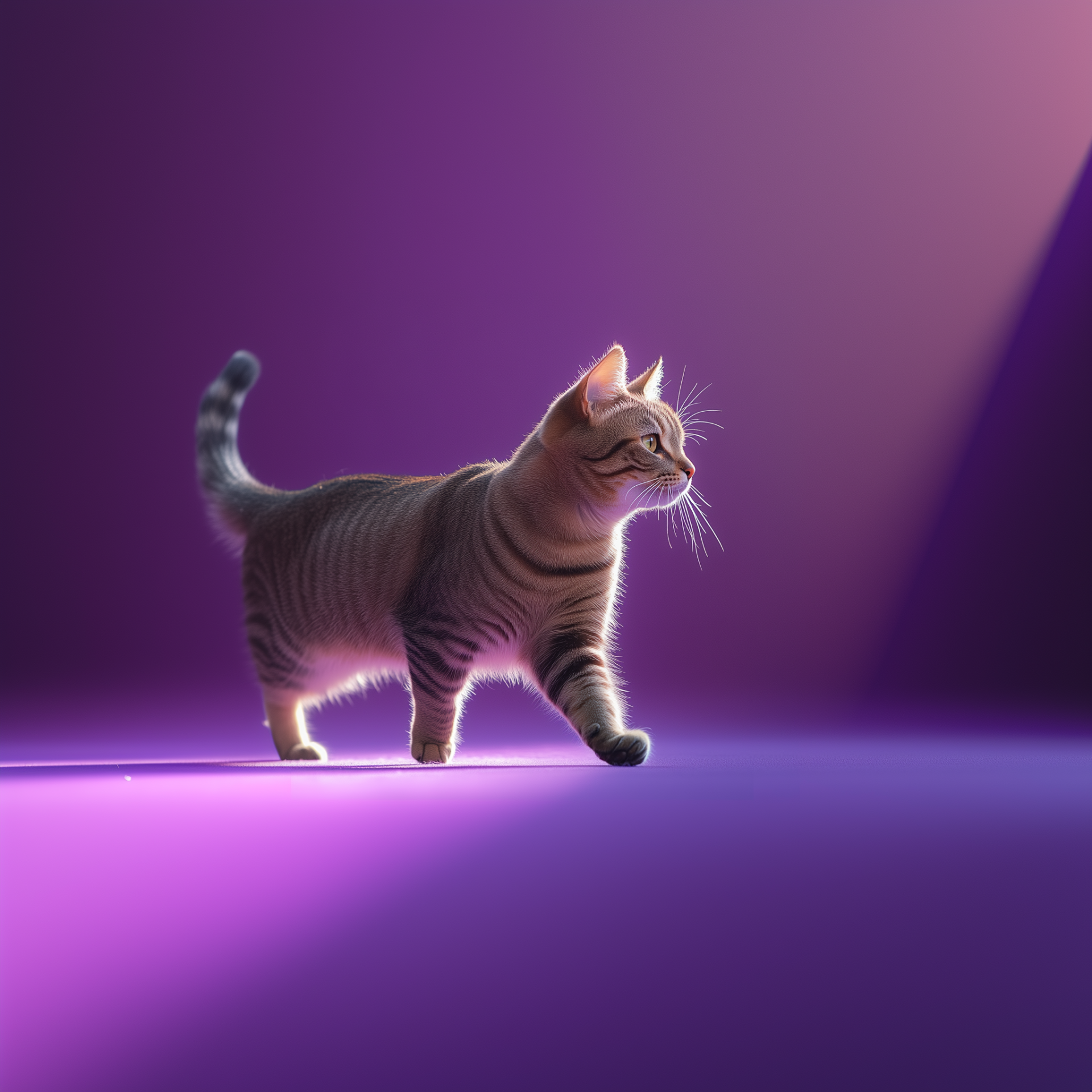 This photo captures a beautiful tabby cat with shiny fur, illuminated by backlighting that outlines its elegant features. The cat walks confidently against a plain purple background, evoking a fashionable, pet model aesthetic.