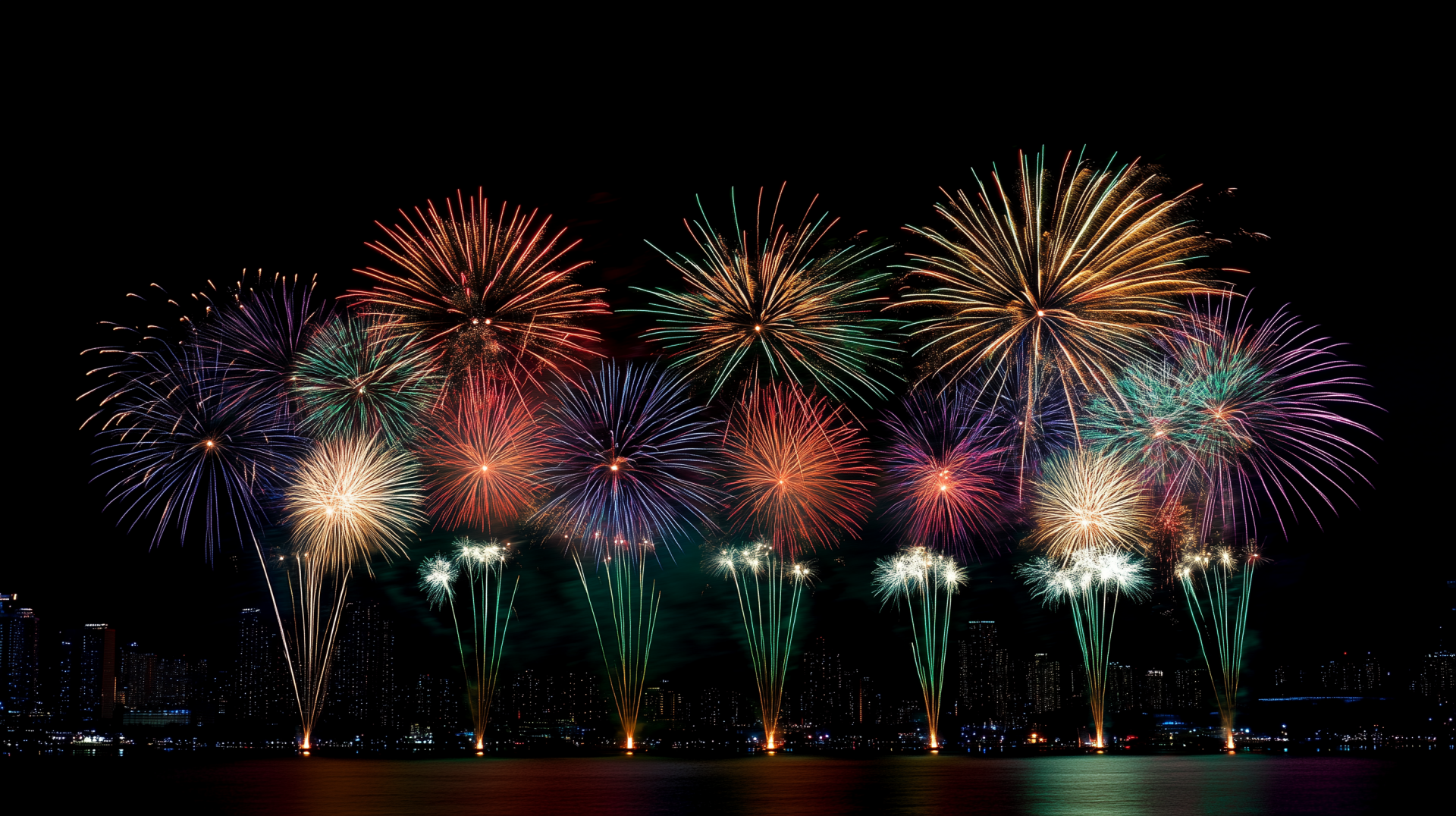 A vibrant display of fireworks lighting up the night sky, celebrating the arrival of the New Year. The colors burst and spread in various patterns, creating a festive atmosphere filled with excitement and joy.