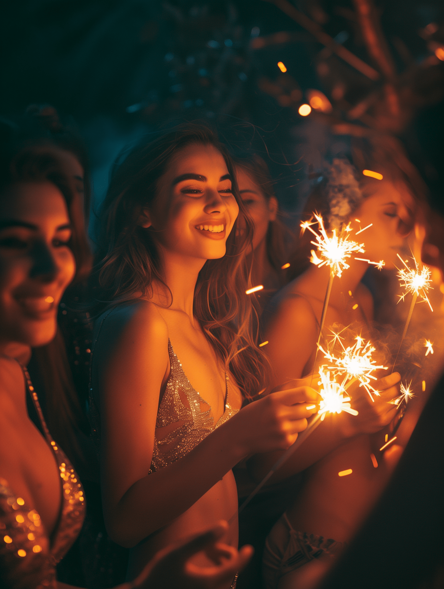 A group of women joyfully celebrating the end of the year in a dark environment. The woman in focus is holding a lit sparkler, radiating light and happiness amidst a festive atmosphere filled with excitement.