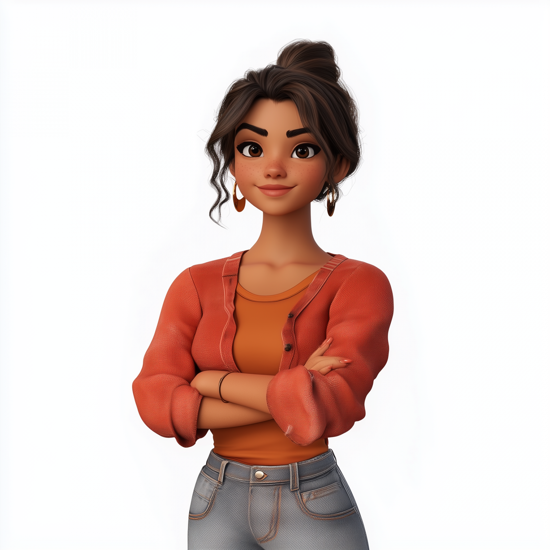 A young woman stands with her arms crossed and a slight smile on her face, exuding a sense of happiness. The style is reminiscent of popular 3D character designs, set against a clean white background.