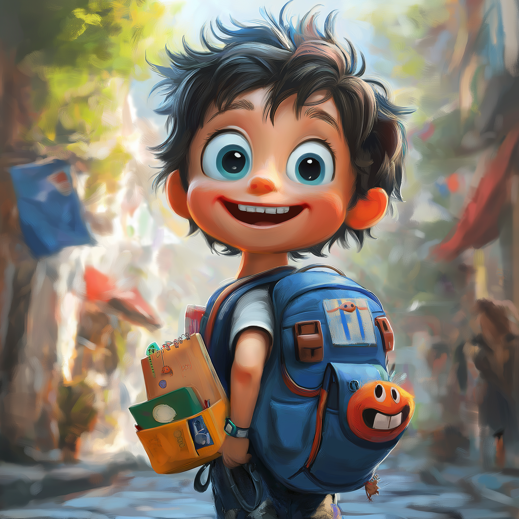 A vibrant and cheerful illustration of a four-year-old child excitedly heading to school for the first time. The character is depicted with a joyful expression, wearing a colorful backpack and surrounded by a lively school environment that captures the magic of a Pixar-style animation.
