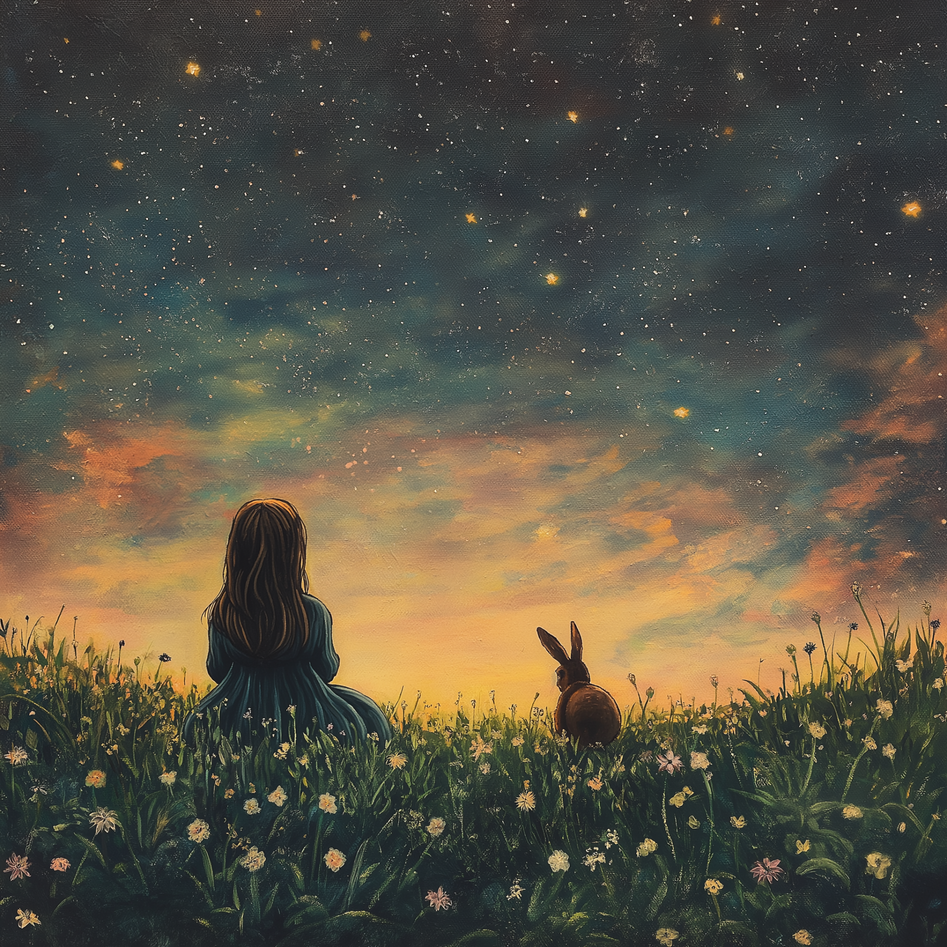 A happy young girl walks along a lush grassy path adorned with blooming flowers, accompanied by her cheerful bunny friend. The night sky above is slightly dark, sprinkled with a few twinkling stars, creating a whimsical and serene atmosphere.