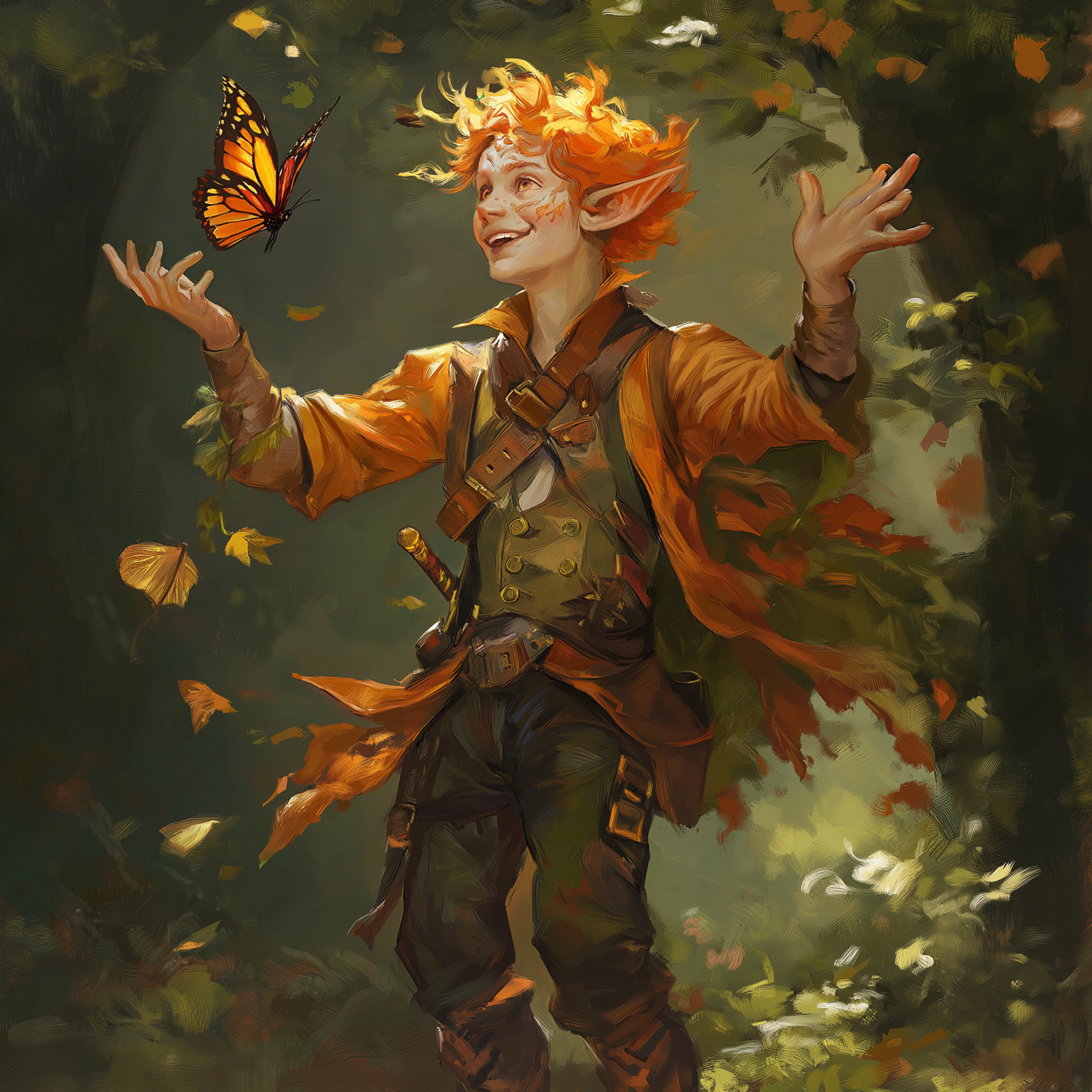 This illustration captures a joyful and carefree Eladrin bard in mid-run, his pale orange skin and leafy autumn hair creating a whimsical appearance. The fiery red orange of his eyes glimmers with excitement as he chases a butterfly in a vibrant and magical setting.