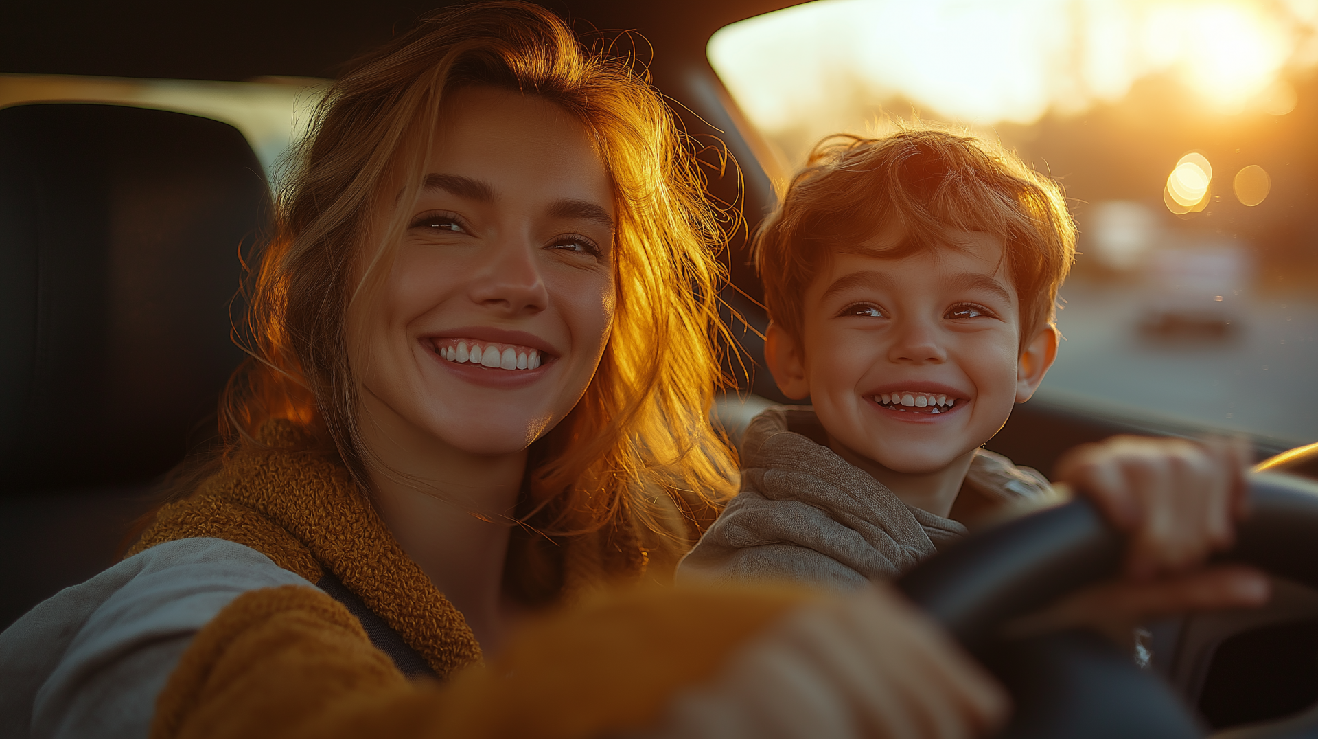 A young mother beams with happiness as she drives her car, her joyful son beside her. Sunlight filters through the windows, creating a warm and inviting atmosphere that captures a special moment together.