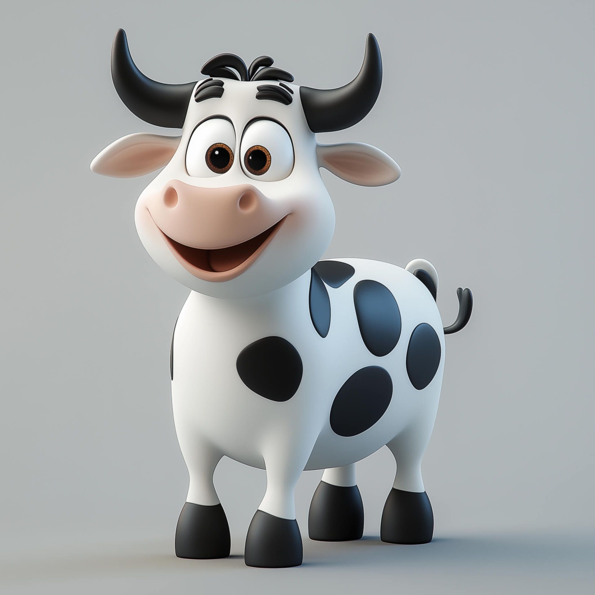 This image features an adorable 3D cow designed in a vibrant Pixar style. With a playful expression and classic white fur, the cow radiates warmth and friendliness.