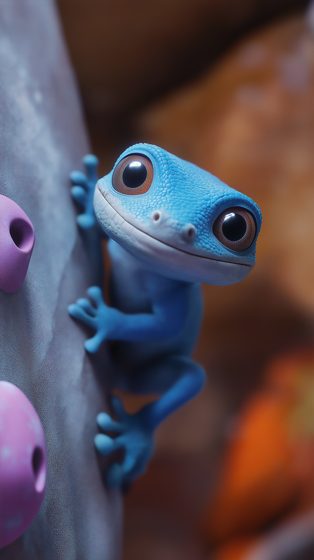 The image features a cute blue gecko with a happy expression, captured in a cinematic and photorealistic style. It is seen climbing on colorful holds in a bouldering gym, showcasing its playful nature.
