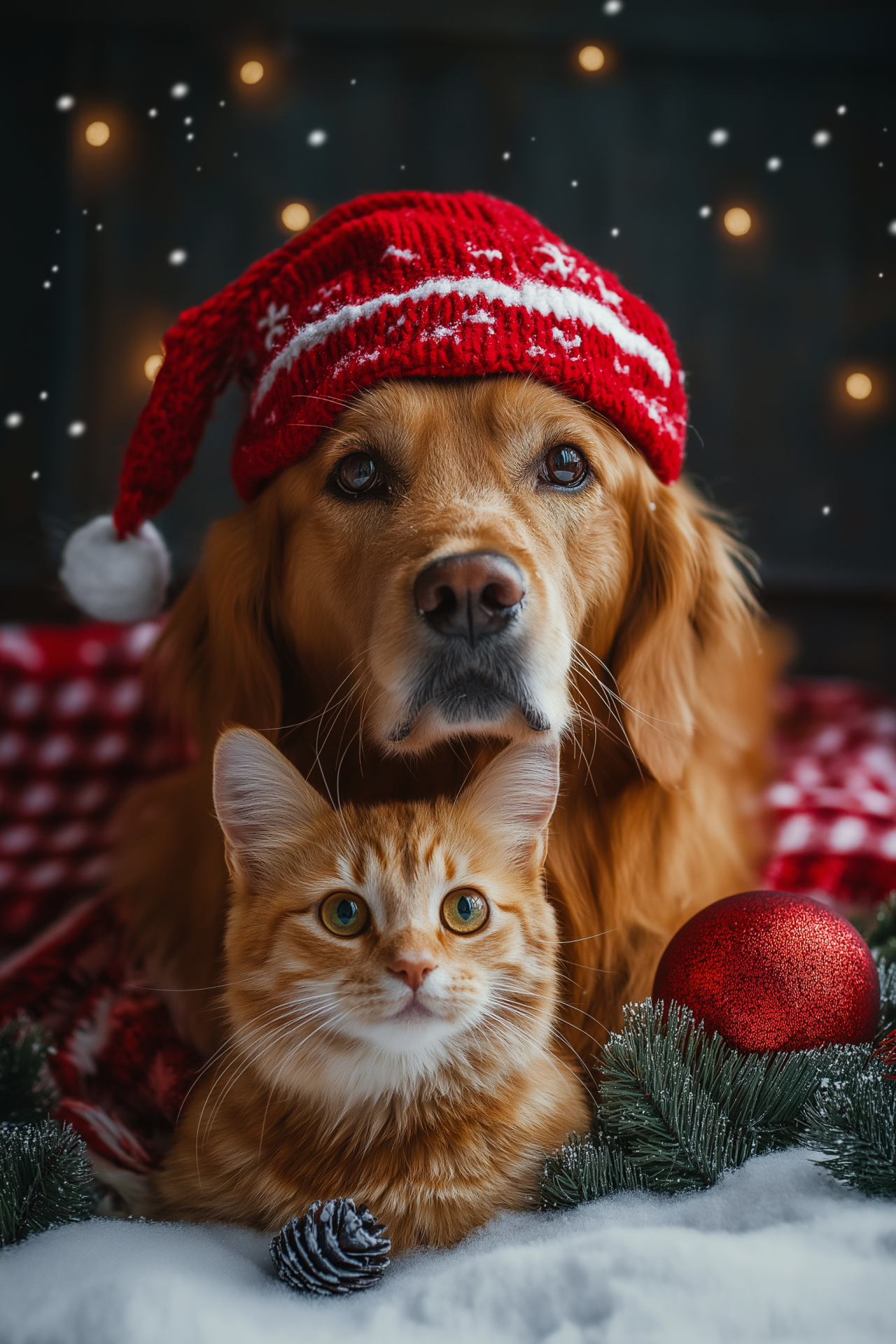 The image captures a heartwarming scene of a cheerful dog and an adorable cat dressed in festive attire, surrounded by colorful Christmas decorations. The vibrant colors and realistic details create a joyful holiday atmosphere, making it a perfect representation of seasonal cheer.