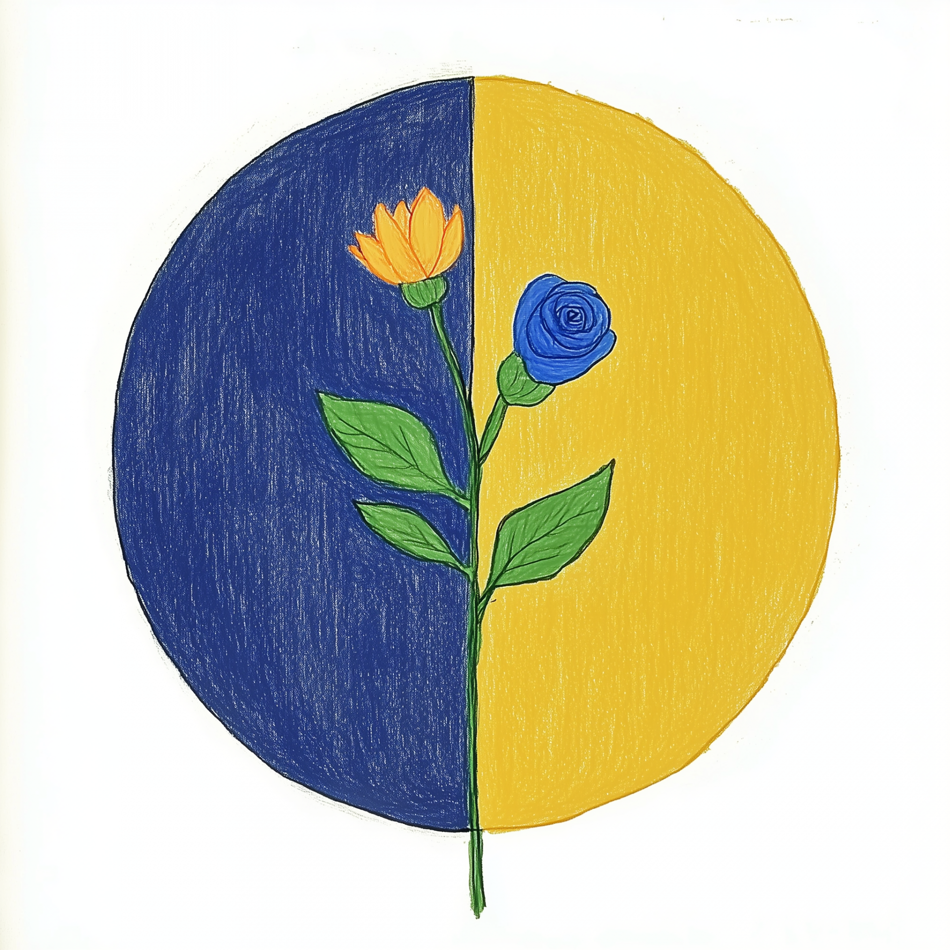 This illustration features a bright and cheerful circle, divided in half with yellow and blue. From the center, a green plant stretches upward, while yellow flowers bloom outside the blue section and a blue rose emerges from the yellow half, all depicted in a simple, childlike style.