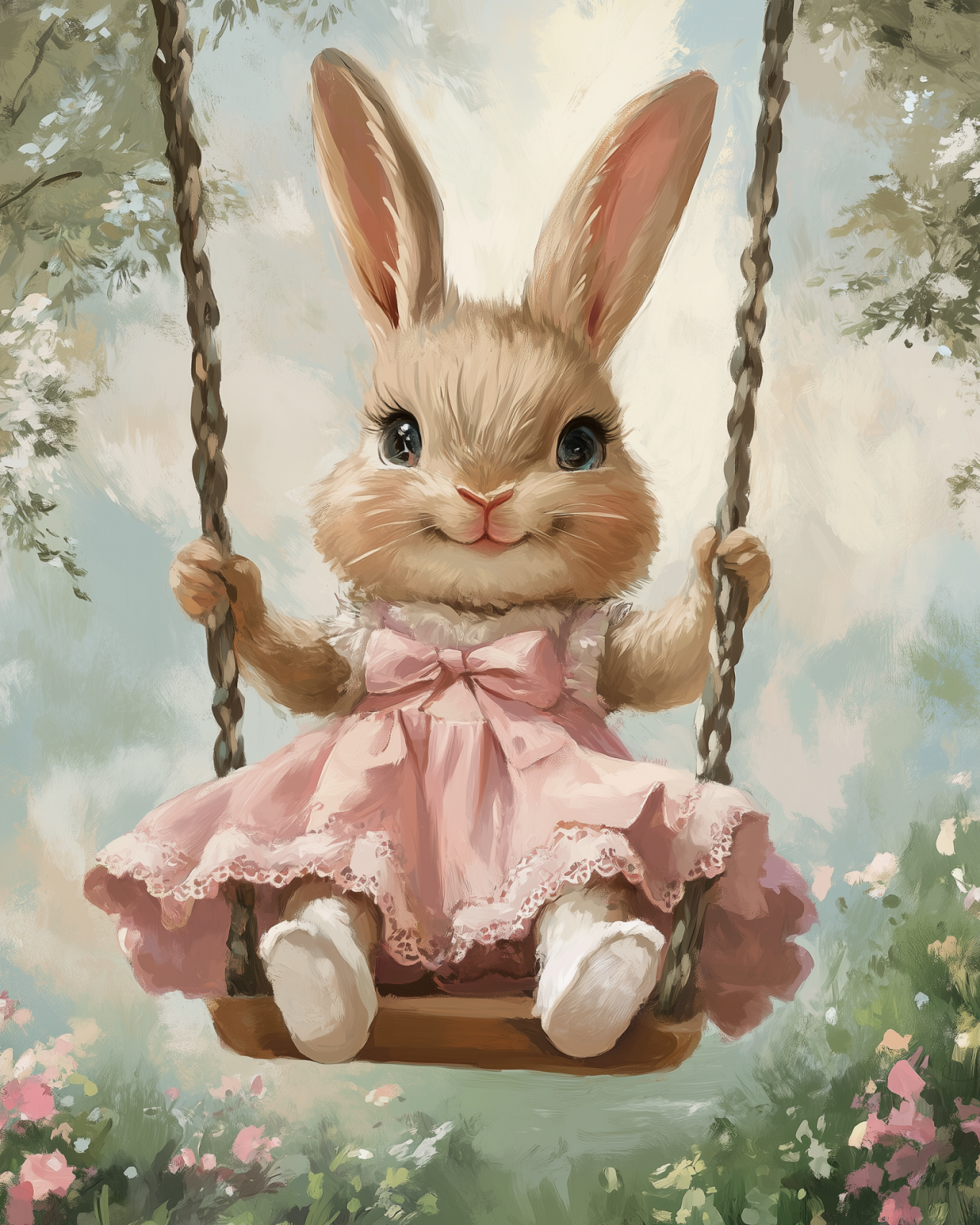 This charming image features a cute smiling bunny happily swinging, dressed in an adorable pink dress. The overall atmosphere is whimsical and cheerful, evoking feelings of joy and playfulness.