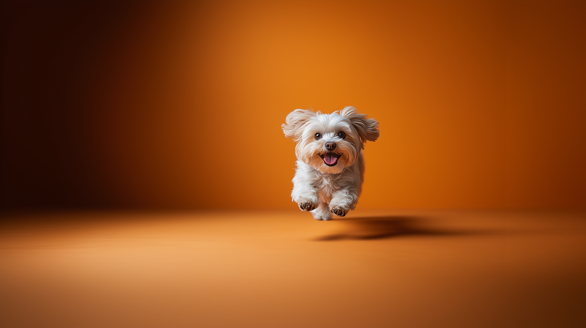 A joyful Shih Tzu is captured mid-run, showcasing its playful nature. The image features a vibrant orange background that adds a warm atmosphere, illuminated by three distinct sources of natural light.