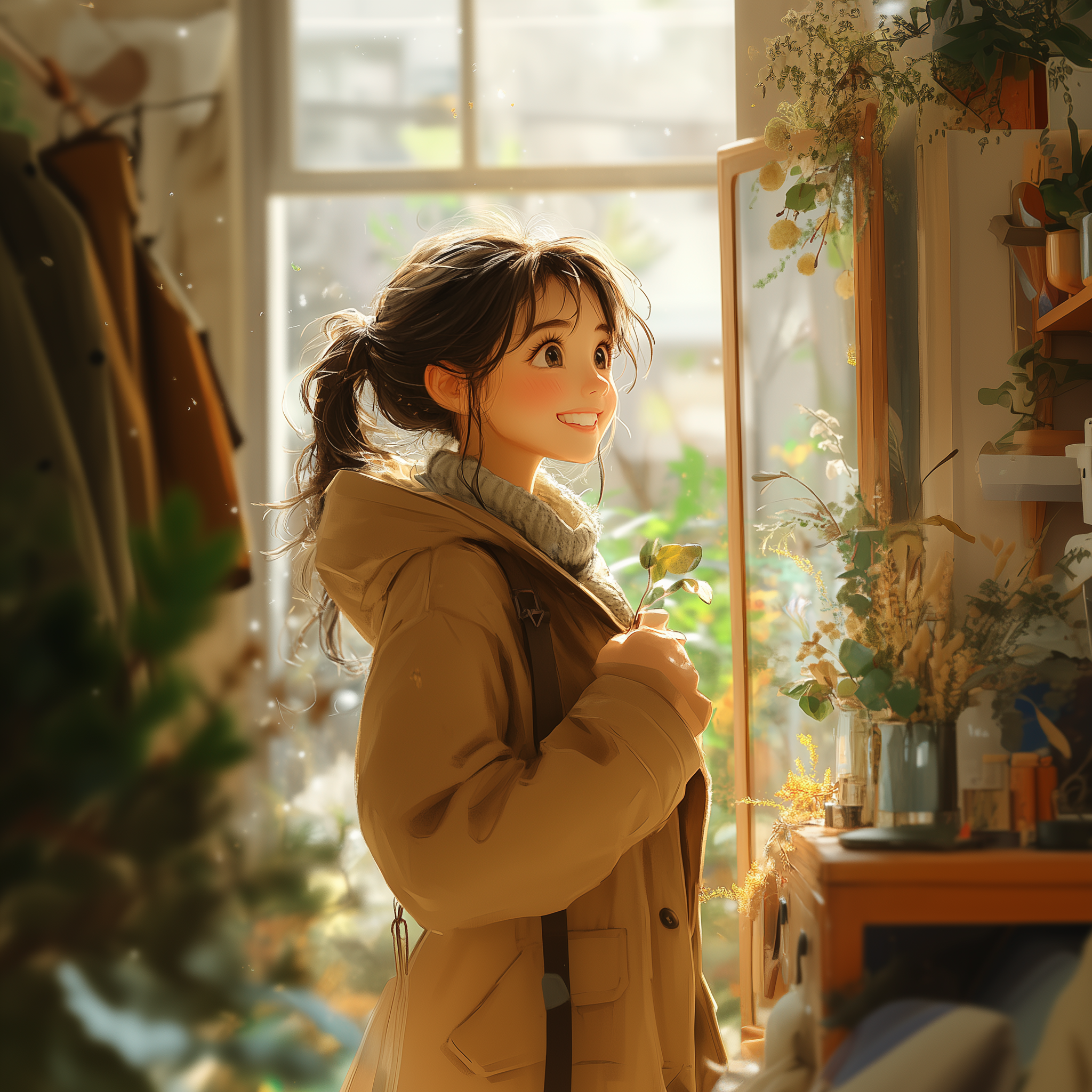 The image showcases a girl with a joyful expression, pulling her coat while standing in front of a mirror. The background features a cozy bedroom setting, enhancing the warm atmosphere of the scene.