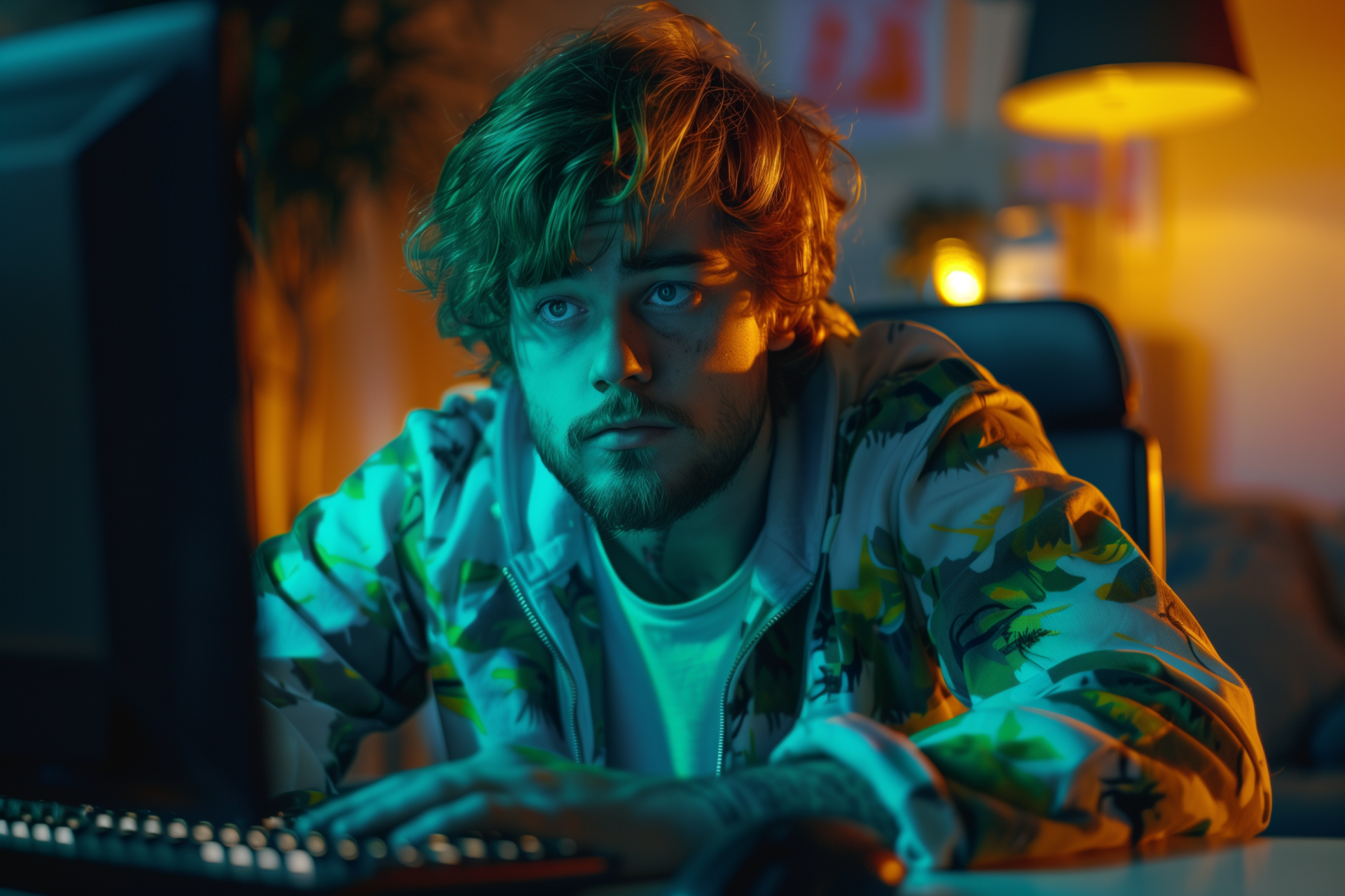 The image captures a man experiencing a mix of stress and happiness as he gazes intently at his computer screen. The cinematic style features vibrant shades of green and yellow, creating a sharp and captivating visual experience.