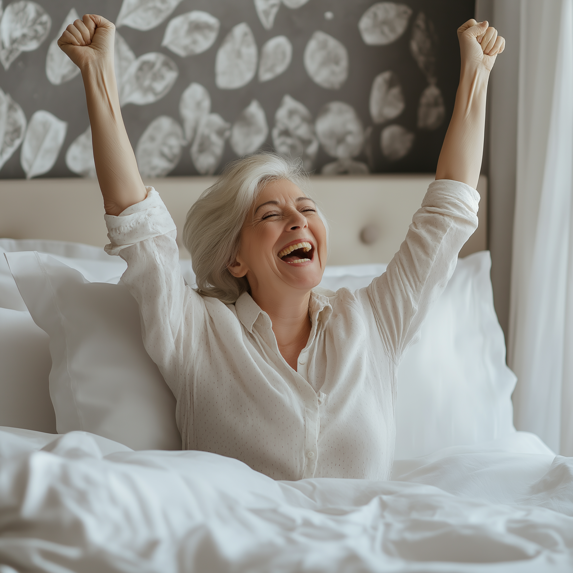 The image captures a middle-aged woman waking up from her bed with an expression of pure joy and energy. The warm sunlight streaming in through the window enhances the cheerful atmosphere of the room.