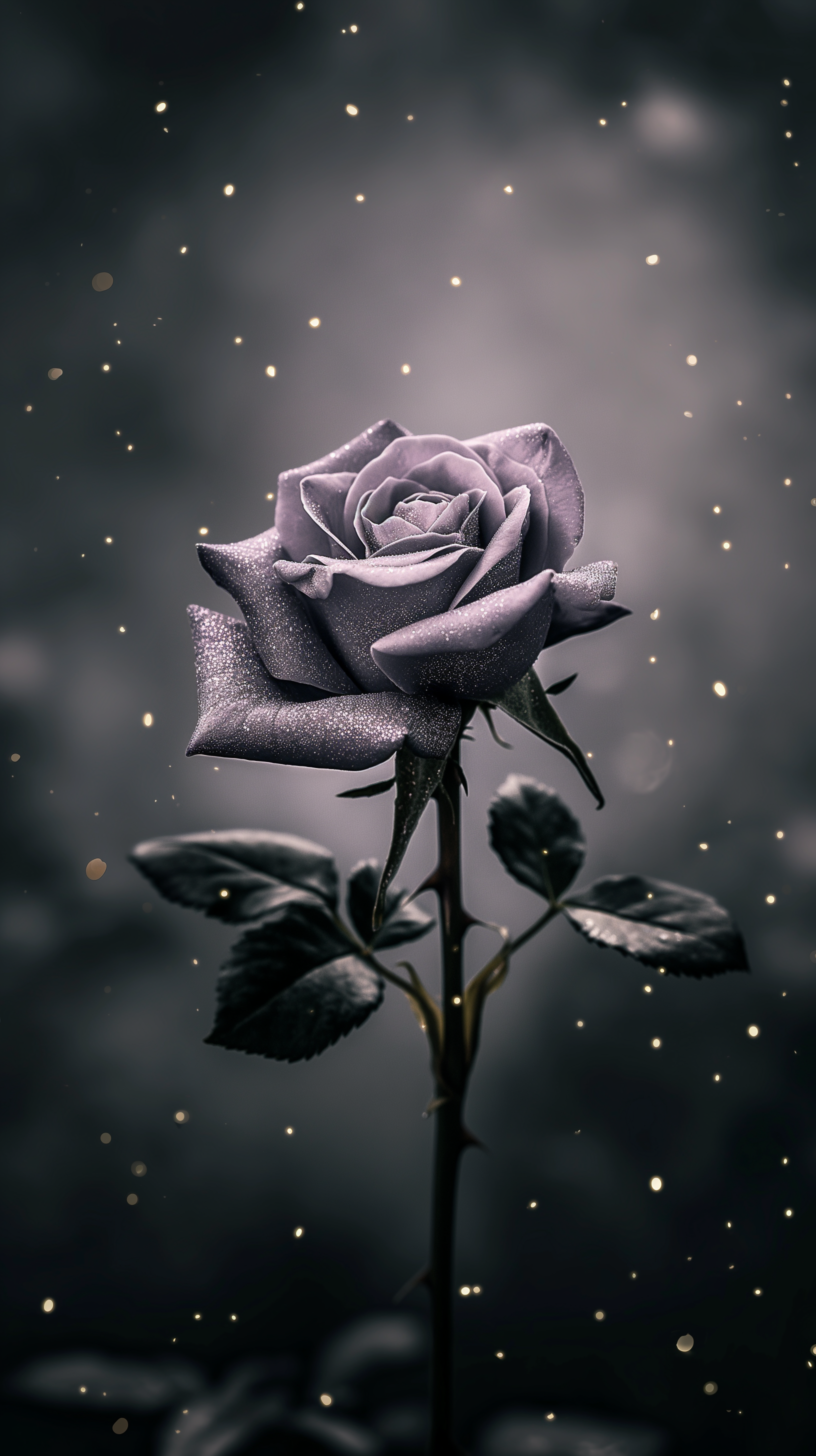 Monochrome image of a single rose with dewdrops, set against a dark, starry background.