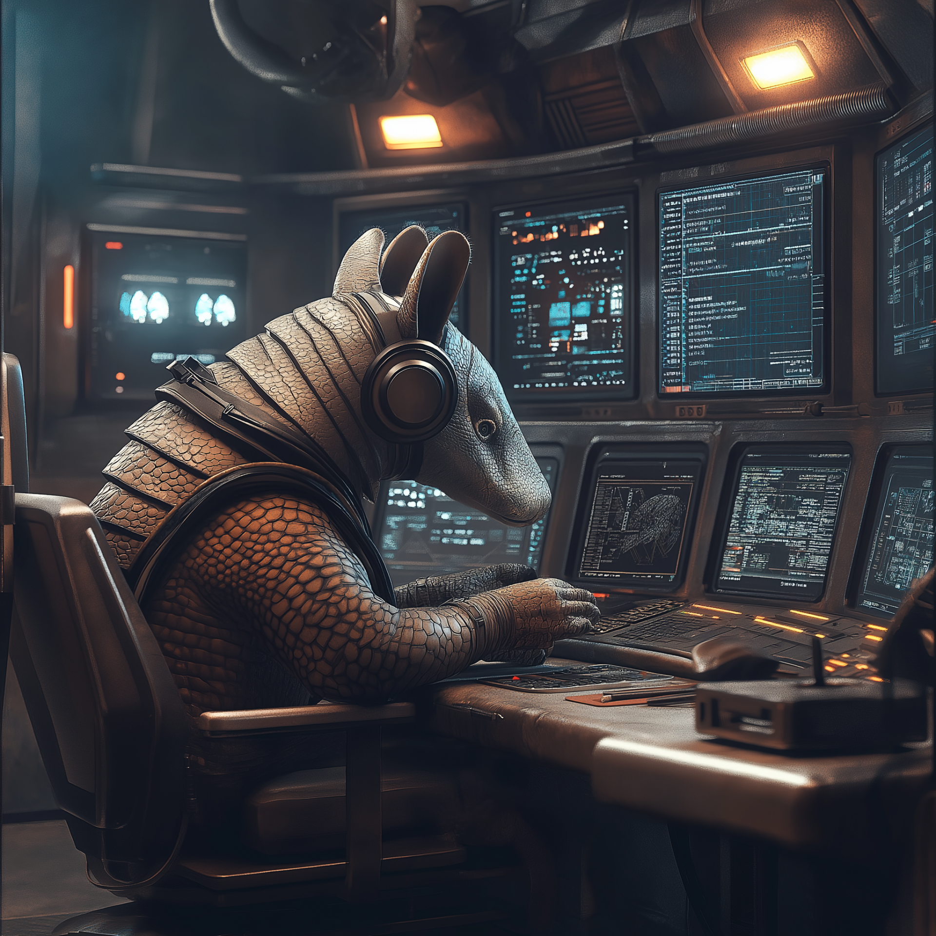 The image showcases a photorealistic armadillo, wearing headphones, intently gazing at multiple glowing screens. The setting is a darkened retro command center, emanating a futuristic yet nostalgic atmosphere.